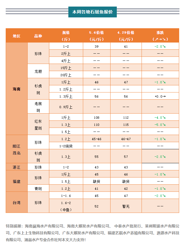 | 中國(guó)水產(chǎn)頻道原創(chuàng)報(bào)道, 節(jié)后石斑魚價(jià)格回落,市場(chǎng)交易量較低,近期價(jià)格或?qū)⒊掷m(xù)波動(dòng) 文/ 水產(chǎn)前沿 何鴻浩 行情簡(jiǎn)析 海南地區(qū):本周海南地區(qū)的石斑魚價(jià)格出現(xiàn)較大幅度的回落,最高跌幅達(dá)5元/斤。珍珠1斤上規(guī)格39元/斤,下跌2元/斤。紅東星斑跌幅較大,1斤上規(guī)格報(bào)價(jià)108元/斤,下跌4元/斤,1.3斤上規(guī)格報(bào)價(jià)110元/斤,下跌5元/斤。衫虎斑小幅下跌,1斤上規(guī)格46元/斤,1.3斤上規(guī)格56元/斤。從業(yè)者表示,現(xiàn)在魚價(jià)都跌了,但節(jié)后掉價(jià)是正常情況,目前這個(gè)跌幅仍在可接受范圍內(nèi)。 廣東地區(qū):本周廣東地區(qū)石斑魚價(jià)格繼續(xù)回落。陽(yáng)江、茂名地區(qū)珍珠斑1.2斤上規(guī)格統(tǒng)貨報(bào)價(jià)45-46元/斤,下跌1元/斤。衫虎斑1.3斤上規(guī)格報(bào)價(jià)56元/斤。陽(yáng)茂從業(yè)者表示,節(jié)后這兩天基本沒出魚,估計(jì)魚價(jià)可能還會(huì)有1-2元/斤的波動(dòng)。 福建地區(qū):本周福建石斑魚價(jià)格略有波動(dòng),下跌1元/斤。目前,珍珠斑1斤上規(guī)格報(bào)價(jià)45元/斤,青斑1.2斤上規(guī)格報(bào)價(jià)41元。當(dāng)?shù)貥I(yè)者表示,主要還是沒生意,“五一”期間生意一般,節(jié)后更沒生意。雖然價(jià)格保不住,但也不會(huì)跌太多,還是有較大盈利空間的。總的來(lái)說,今年都能保持在40元/斤以上,價(jià)格還是不錯(cuò)的。 臺(tái)灣地區(qū):本周臺(tái)灣地區(qū)珍珠斑價(jià)格與上周相比,價(jià)格稍有回落,跌幅約1-2元/斤,小規(guī)格魚報(bào)價(jià)為45元/斤,中規(guī)格魚報(bào)價(jià)為52元/斤。業(yè)者表示,節(jié)后的市場(chǎng)很淡,成交量低迷,估計(jì)價(jià)格還會(huì)有所回落。 |