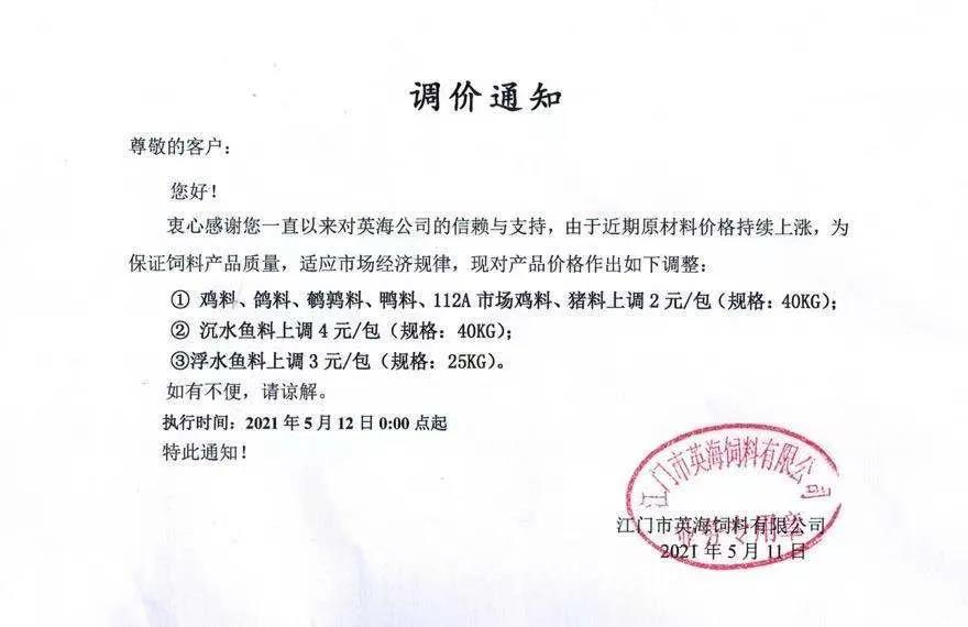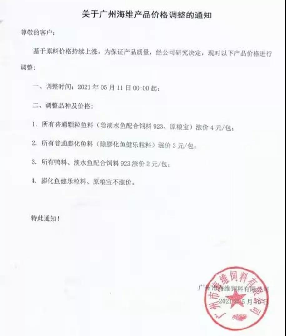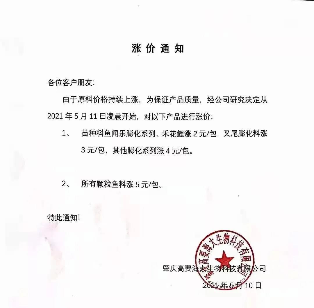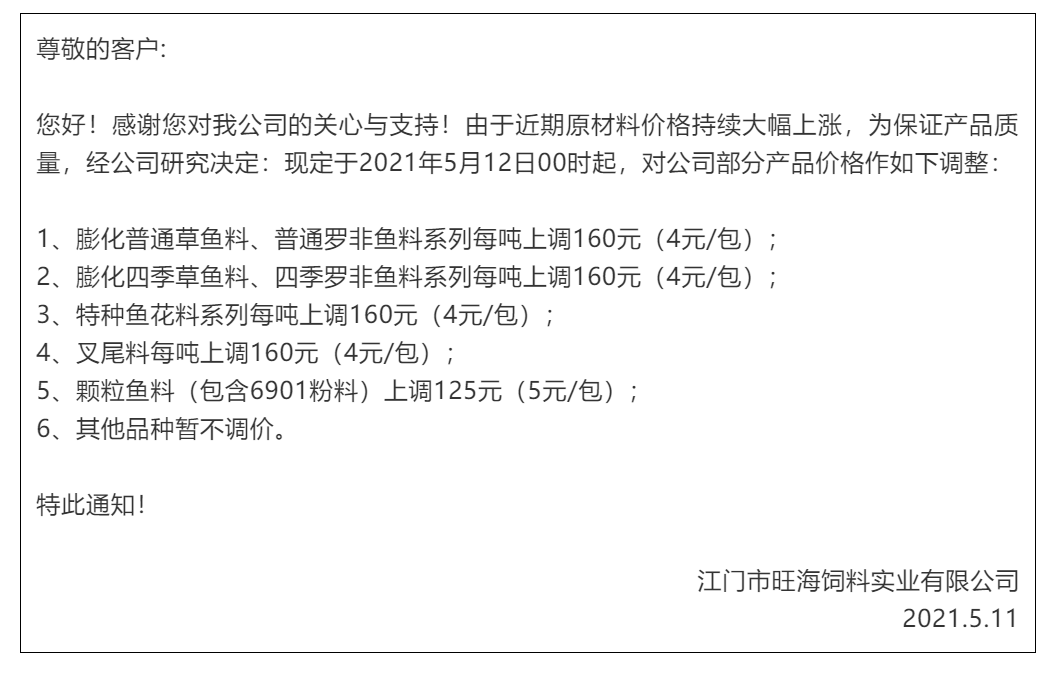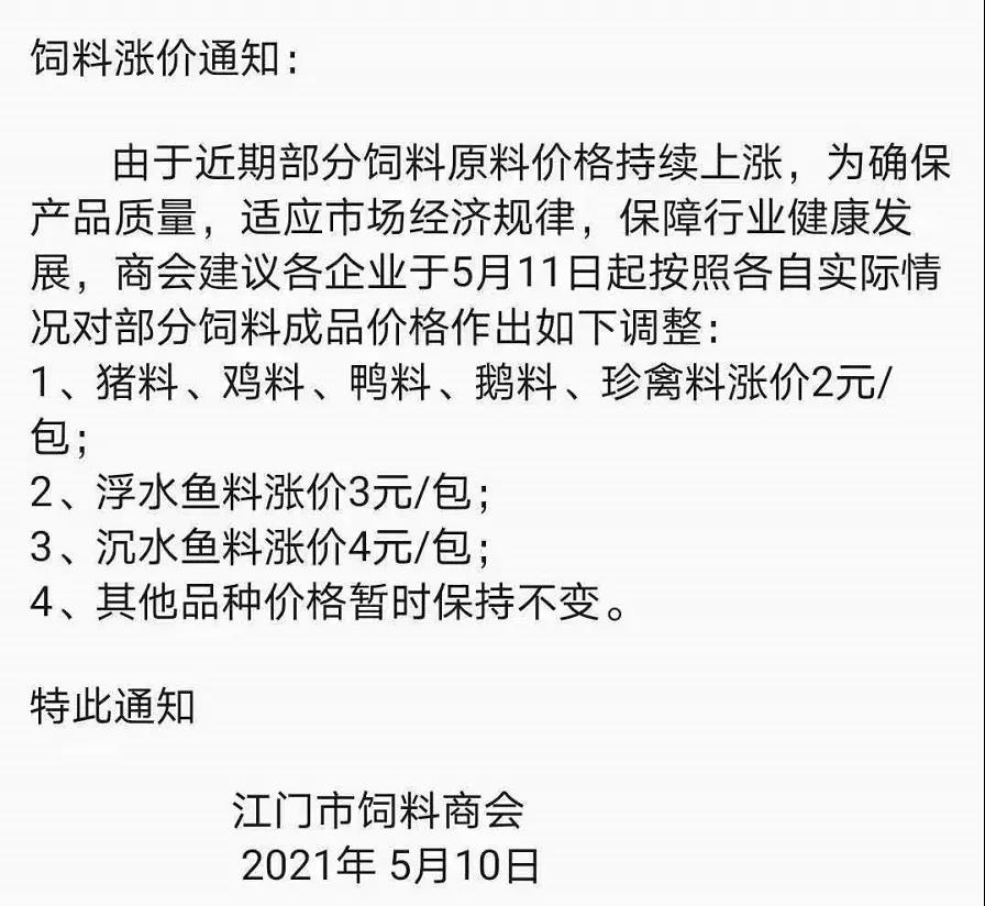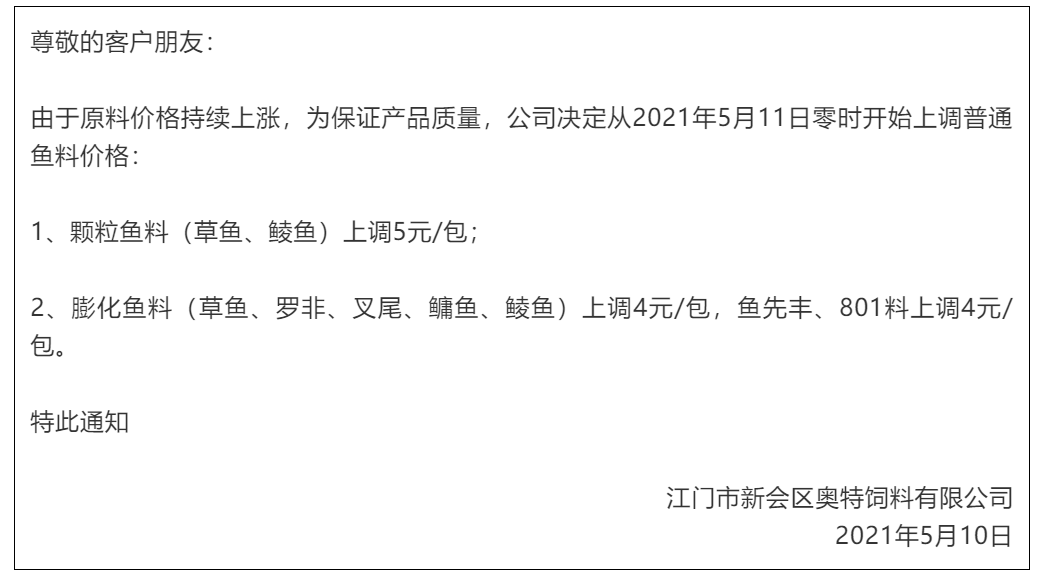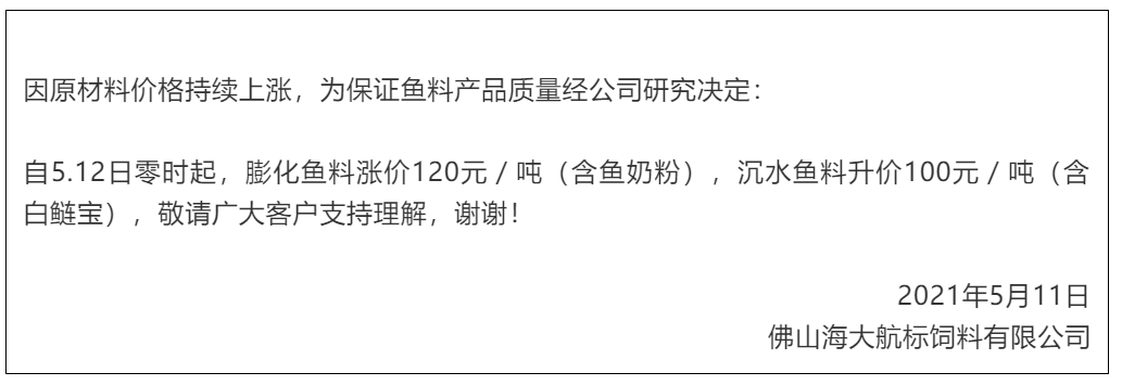 文/ 水產(chǎn)前沿 獨(dú)家整理 水產(chǎn)前沿網(wǎng)報(bào)道,水產(chǎn)料掀起牛年的第二輪瘋狂漲價(jià)潮!目前20多家料企在5天內(nèi)漲價(jià)! 海大、通威、粵海、新希望、旺海、 百洋...20多家料企發(fā)布漲價(jià)令 自5月10日第一家水產(chǎn)料企發(fā)布漲價(jià)令后,一大波料企緊急跟進(jìn)。包括有海大幾家子公司、通威、粵海、新希望、旺海、百洋、廣牧興、豐華、南寶、向星、傲弘、奧特、養(yǎng)之源、聯(lián)維、英海、遼海等20多家料企連續(xù)5日發(fā)布漲價(jià)令。 主要漲價(jià)品種為大宗淡水魚料的草魚、羅非魚、鯉魚、叉尾魚、鳙魚、鯪魚等以及魚苗料,還有部分企業(yè)上漲黃顙魚料。漲幅在2-5元/包不等。 豆粕同期漲1000元、玉米漲800元/噸! 原料價(jià)格同比大幅暴漲 從以上兩表看出,主流市場(chǎng)的豆粕價(jià)格在2021年5月12日最高為3780元/噸,比2020年5月12日2810元/噸,上漲近1000元/噸。玉米同期比上漲近800元/噸。菜粕上漲近700元/噸。棉粕上漲超500元/噸。 飼料價(jià)格上漲,主要是豆粕、玉米、菜粕大幅漲價(jià)有關(guān)。 據(jù)了解,未來幾天還將有料企跟漲,目前澳華已明確表示,5月16日將漲價(jià)。 又有料企發(fā)布最新漲價(jià)消息 百洋飼料漲價(jià)通知 百躍農(nóng)牧發(fā)展有限公司漲價(jià)通知 佛山廣牧興、廣東唐農(nóng)飼料漲價(jià)通知 海南省飼料獸藥行業(yè)協(xié)會(huì)飼料漲價(jià)通知 近日(已發(fā)布)料企漲價(jià)通知 廣州市大川飼料有限公司漲價(jià)通知 江門海大飼料有限公司漲價(jià)通知 肇慶高要海大生物科技有限公司漲價(jià)通知 佛山海大航標(biāo)飼料有限公司漲價(jià)通知 珠海海龍生物科技有限公司漲價(jià)通知 廣州市海維飼料有限公司漲價(jià)通知 廈門通威飼料有限公司漲價(jià)通知 中山市泰山飼料有限公司漲價(jià)通知 廣東傲弘生物科技有限公司 佛山市順德區(qū)豐華飼料實(shí)業(yè)有限公司 臺(tái)山市向星飼料有限公司 廣東南寶集團(tuán)漲價(jià)通知 江門市新會(huì)區(qū)奧特飼料有限公司漲價(jià)通知 江門市六和飼料有限公司漲價(jià)通知 江門市旺海飼料實(shí)業(yè)有限公司漲價(jià)通知 惠州養(yǎng)之源飼料科技有限公司漲價(jià)通知 江門聯(lián)維飼料有限公司漲價(jià)通知 江門市英海飼料有限公司漲價(jià)通知 江門市新會(huì)區(qū)遼海飼料有限公司漲價(jià)通知 江門飼料商會(huì)漲價(jià)通知 |