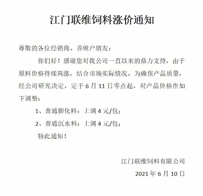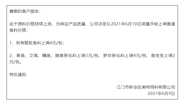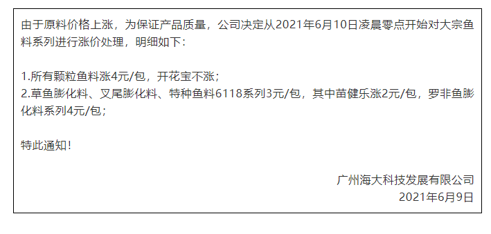 | 中國水產(chǎn)頻道綜合報道, 快備貨,蝦料、魚料多品種又緊急大漲 文/水產(chǎn)前沿獨家整理 昨天,海大旗下幾大子公司珠海海龍、廣州海大、廣州海維、高要海大、新會奧特等同步上調(diào)普通淡水魚料價格,這是自5月11日在業(yè)中第一個挑起漲價企業(yè),在不足一個月內(nèi)又一次高調(diào)宣布飼料漲價,引發(fā)了行業(yè)不小震動、高度關(guān)注以及各種猜測。 令人意外的是,華南地區(qū)跟漲的料企尤其是主流料企的數(shù)量并不多,但華中地區(qū)大波飼料瘋狂漲價,包括海大、通威、粵海、正大、澳華、新希望、正邦全線大漲。漲價品種主要是普水魚料和對蝦料,最高漲幅達300元/噸。 華中地區(qū)漲價料企詳情 華南(珠三角)地區(qū)漲價料企詳情 據(jù)悉,珠三角更多料企對于這次漲價是否跟進,態(tài)度還在搖擺觀望中,這一次除了海大,大家也在注意同行的動態(tài),可能在2-3天內(nèi)有更多的結(jié)果,水產(chǎn)前沿將持續(xù)關(guān)注。 |