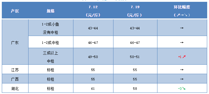 文/圖 何氏水產(chǎn)、水產(chǎn)前沿 黃家茵 桂花魚(yú) 水產(chǎn)前沿網(wǎng)原創(chuàng)報(bào)道,廣東鱖魚(yú)塘頭價(jià)格經(jīng)過(guò)前幾輪過(guò)山車(chē)式的漲跌后,本周終于基乎趨于平穩(wěn)了。縱觀現(xiàn)在廣東鱖魚(yú)老魚(yú)的存塘量,還是以偏小魚(yú)為主,偏大魚(yú)出一塘少一塘了,有些主產(chǎn)區(qū)現(xiàn)在只剩下幾塘存貨了。目前新魚(yú)頭批苗魚(yú)頭個(gè)別有0.7-0.8,個(gè)別有報(bào)大點(diǎn)的,預(yù)估在7月底到8月初會(huì)個(gè)別出一兩塘新魚(yú),但真正新魚(yú)推出市場(chǎng)要到8月中旬。目前市場(chǎng)流通量還沒(méi)有明顯好轉(zhuǎn),整體銷(xiāo)量還是不大,市場(chǎng)行情會(huì)出現(xiàn)兩極分化,偏小魚(yú)受到新魚(yú)(病魚(yú))的沖擊還有供大于求的影響下價(jià)格還會(huì)有下跌的空間,相反,偏大魚(yú)由于存塘不多,短期內(nèi)未必能滿足市場(chǎng)需求,價(jià)格會(huì)上上升空間。本周塘頭報(bào)價(jià):1-2成小魚(yú)沒(méi)有中桂開(kāi)塘43-44元/斤,與上周價(jià)格差不多;1-2成中桂開(kāi)塘價(jià)46-47元/斤,與上周持平;三成以上中桂50-51元/斤,比上周上升了1元/斤。預(yù)計(jì)下周所有規(guī)格的價(jià)格還會(huì)有波動(dòng)。 廣西產(chǎn)區(qū)標(biāo)桂價(jià)格與上周持平,報(bào)價(jià)還有55元/斤;湖北產(chǎn)區(qū)標(biāo)桂價(jià)格比上周下跌了3元/斤,報(bào)價(jià)58元/斤;江蘇地區(qū)標(biāo)桂價(jià)格本周保持穩(wěn)定,報(bào)價(jià)還是55元/斤,各地鱖魚(yú)存塘基本接近尾聲,出魚(yú)量很少,新魚(yú)也暫時(shí)沒(méi)有那么早上市,接下來(lái)價(jià)格會(huì)跟隨廣東價(jià)格有所小幅波動(dòng)。 何氏水產(chǎn)與水產(chǎn)前沿聯(lián)合播報(bào) 各地區(qū)桂花魚(yú)出塘價(jià) 注:上述價(jià)格及行情分析僅供參考,市場(chǎng)有風(fēng)險(xiǎn),入市需謹(jǐn)慎 |