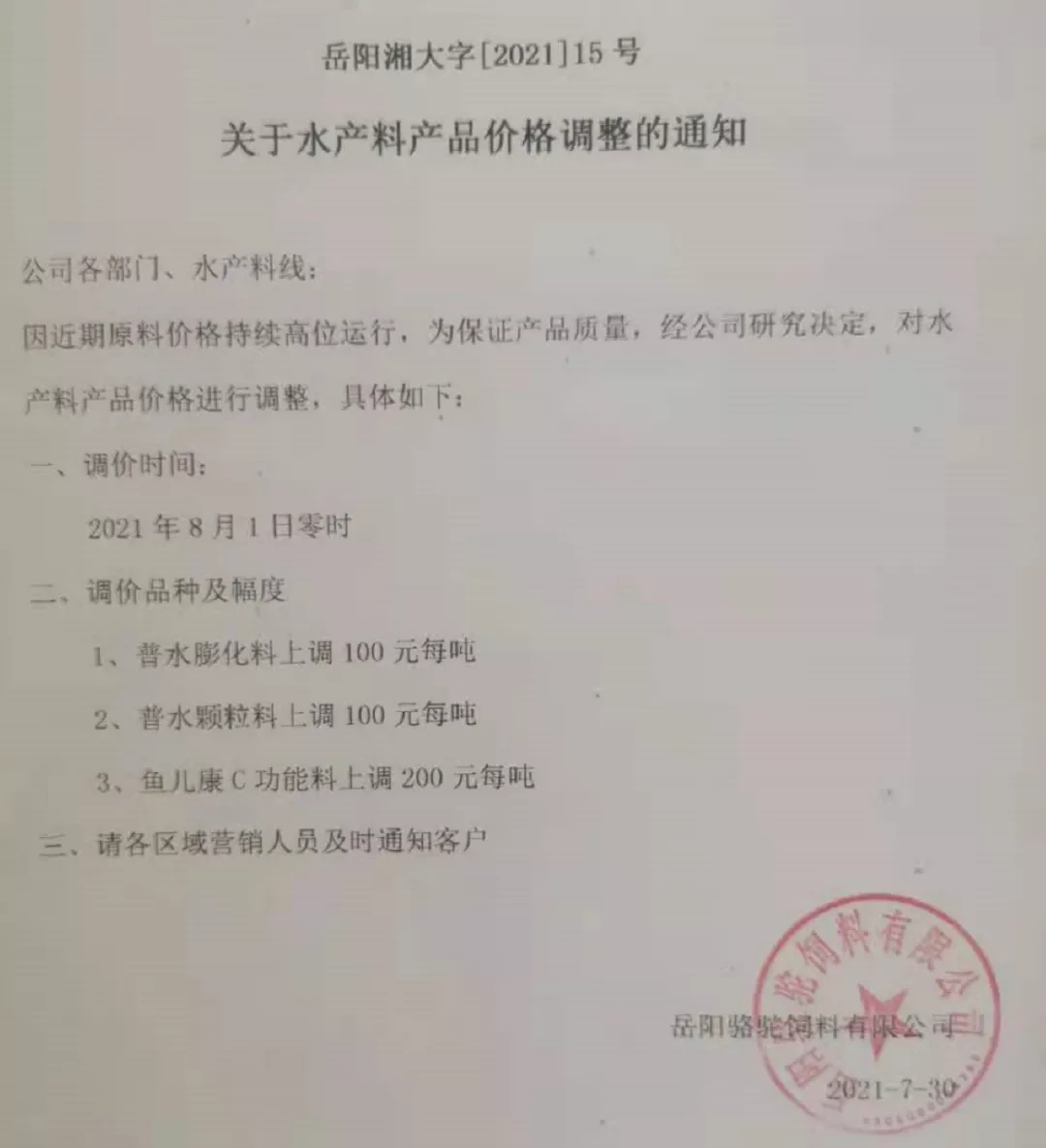 | 中國(guó)水產(chǎn)頻道綜合報(bào)道, 粵海、海大、新希望水產(chǎn)料漲價(jià),最高漲200元/噸 文/ 水產(chǎn)前沿 整理 日前,華中地區(qū)的湖南市場(chǎng)多個(gè)料企宣布水產(chǎn)料漲價(jià),湖南海大、洞庭海大、益陽(yáng)新希望、益陽(yáng)湘大、岳陽(yáng)湘大等宣布8月1日零時(shí)起同步上漲。漲價(jià)品種為大宗普水料和魚苗料,其中苗料漲價(jià)幅度在100-200元/噸、普水料的顆粒料和膨化料漲價(jià)幅度在100-150-200元/噸。 接著,湖南粵海在昨天也發(fā)漲價(jià)通知,8月5日零時(shí)漲價(jià),顆粒料和膨化料分別漲100元/噸。此外,懷化海大、常德新希望與其他湖南集團(tuán)子公司一起,均在8月1日漲價(jià),最高漲200元/噸,現(xiàn)補(bǔ)發(fā)漲價(jià)通知。 具體如下: 湖南粵海飼料有限公司漲價(jià)通知 懷化海大生物飼料有限公司漲價(jià)通知 常德新希望飼料有限公司漲價(jià)通知 據(jù)悉,目前湖南地區(qū)疫情有進(jìn)一步蔓延趨勢(shì),多地實(shí)地交通管制,飼料、動(dòng)保、種苗等運(yùn)動(dòng)均受到影響,所以無(wú)論是從疫情角度還是漲價(jià)的趨勢(shì)來(lái)看,養(yǎng)殖戶、經(jīng)銷商抓緊備貨是當(dāng)務(wù)之急的。 8月湖南更多漲價(jià)通知 湖南海大生物飼料有限公司漲價(jià)通知 湖南洞庭海大飼料有限公司漲價(jià)通知 益陽(yáng)新希望飼料有限公司漲價(jià)通知 益陽(yáng)湘大飼料有限公司漲價(jià)通知 岳陽(yáng)湘大飼料有限公司漲價(jià)通知 常德湘大飼料有限公司漲價(jià)通知 |