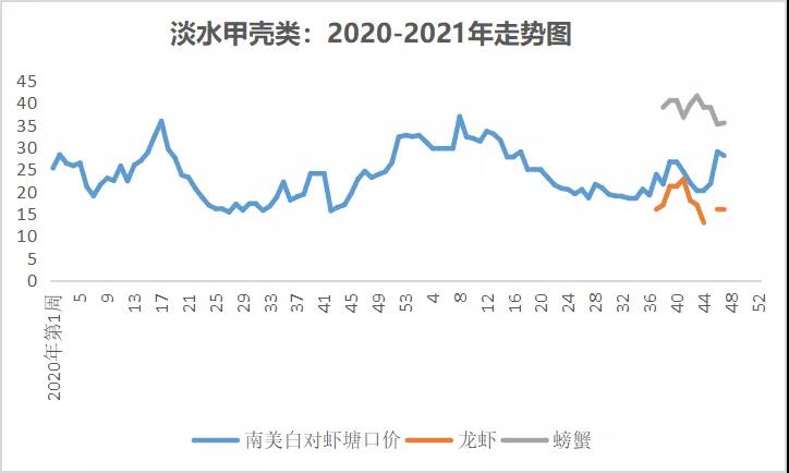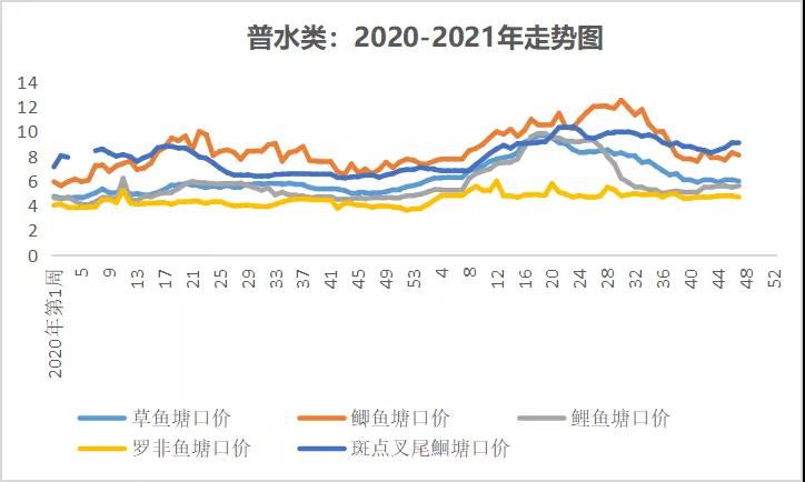 其他特種魚:黃顙、生魚、加州鱸穩(wěn)中有漲 黃顙魚:本周全國黃顙魚塘口均價為10.2元/斤,同比上漲9%,環(huán)比基本持平。湖北地區(qū)目前存塘魚主要是新口魚,目前水溫達10度以上,養(yǎng)殖戶還在積極投喂飼料,價格與上周持平。湖南地區(qū)存塘僅1-2成,養(yǎng)殖戶邊賣邊等價格,受小魚沖擊,價格下跌0.1元/斤。四川、湖北地區(qū)價格與上周持平。 生魚:本周全國生魚塘口均價為12.2元/斤,同比上漲38.55%,環(huán)比漲6.09%。廣東生魚因疫情好轉,流通增加,加之老魚供應減少,價格呈上漲趨勢。 加州鱸魚:本周全國加州鱸魚塘口均價為12.8元/斤,同比上漲6.3%,環(huán)比持平。四川、江蘇吳江地區(qū)加州鱸價格與上周基本持平。 普通淡水魚:鯽魚跌價,草魚、鯉魚、羅非價格相對穩(wěn)定 草魚:本周全國草魚塘口均價為6元/斤,同比上漲18.8%,環(huán)比基本持平。廣東、廣西、福建地區(qū)草魚流通穩(wěn)定,價格與上周基本持平。安徽合肥存塘僅2成,養(yǎng)殖戶陸續(xù)清塘出魚,價格持平。湖北地區(qū)存塘較多,養(yǎng)殖戶因價低惜售,供應較少,流通穩(wěn)定,價格輕微上浮0.1元/斤。潛江主養(yǎng)大草魚,目前需求量較少,冬至后需求量才會增加,目前價格穩(wěn)定。湖南2-3斤存塘魚較多,大草魚存塘較少,大小規(guī)格草魚價差達2-3元/斤,目前市場需求量較少,價格穩(wěn)定。江西因近期天氣好轉,養(yǎng)殖戶積極出魚,價格下跌0.1-0.2元/斤。寧夏因氣溫下降,養(yǎng)殖戶惜售,價格上漲0.2元/斤。四川、重慶、山東等地價格與上周基本持平。 鯽魚:本周全國鯽魚塘口價8.1元/斤,同比上漲23%,環(huán)比跌2.2%。江蘇揚州地區(qū)今年以草鯽混養(yǎng)為主,目前存塘達6-7成,鯽魚存塘同比去年減少約20%,因草魚價格低迷,養(yǎng)殖戶出魚減少,鯽魚價格下跌0.4元/斤。鹽城因螃蟹塘鯽魚陸續(xù)出塘,供應量增加,價格呈下跌趨勢。四川因鯽魚存塘減少,需求量增加,價格上漲0.5元/斤,浙江鯽魚價格與上周持平。 鯉魚:本周全國鯉魚塘口均價為5.6元/斤,同比上漲20%,環(huán)比漲2.4%。遼寧營口因前期下雪、封冰,養(yǎng)殖戶清不了塘,賣魚養(yǎng)殖戶太少,致魚價突然上漲,促進用戶賣魚,價格較上周上漲0.4元/斤。江蘇地區(qū)天氣較好,養(yǎng)殖戶積極出魚,鯉魚流通穩(wěn)定,有卵鯉魚價格依舊堅挺,價格上漲0.1元/斤。河北、黑龍江、河南、天津等地價格與上周基本持平,其中天津因天氣較好,養(yǎng)殖戶積極出魚,70%已清塘。 羅非魚:本周全國羅非魚塘口均價為4.7元/斤,同比上漲21.7%,環(huán)比跌1.3%。廣東、廣西地區(qū)羅非魚存塘僅2-3成,加工廠收魚量收緊,批發(fā)市場流通穩(wěn)定,價格下跌0.1元/斤。廣西、昆明價格與上周持平。 斑點叉尾鮰:本周全國斑點叉尾鮰塘口均價為9.1元/斤,同比上漲40.2%,環(huán)比基本持平。廣東地區(qū)存塘僅4成,因冷空氣襲擊,養(yǎng)殖戶著急出魚,加之拉網損傷,致魚價下跌0.3元/斤。江蘇地區(qū)叉尾存塘較少,價格較上周上漲0.4元/斤。湖北地區(qū)叉尾價格上漲0.5元/斤。四川地區(qū)價格與上周基本持平。 淡水甲殼類:中華絨螯蟹最高上漲12元/斤 中華絨螯蟹:本周全國中華絨螯蟹塘口均價為35.5元/斤,環(huán)比基本持平。安徽地區(qū)存塘陸續(xù)減少,母蟹價格上漲12元/斤。湖北、江蘇地區(qū)價格與上周持平。 本周各區(qū)域塘口價格: | ||||||||||||||||||||||||||||||||||||||||||||||||||||||||||||||||||||||||||||||||||||||||||||||||||||||||||||||||||||||||||||||||||||||||||||||||||||||||||||||||||||||||||||||||||||||||||||||||||||||||||||||||||||||||||||||||||||||||