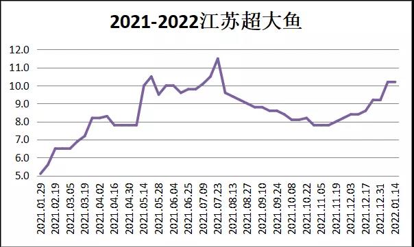 文/ 水產(chǎn)前沿 曾鈴程 江蘇超大魚2021-2022價(jià)格走勢 叉尾鮰魚一周概要 水產(chǎn)前沿網(wǎng)原創(chuàng)報(bào)道,短期看,疫情對鮰魚走量等影響有所顯現(xiàn),主要因?yàn)楹幽稀⑻旖、西安等主要市場都受到影響。?jù)了解,河南鮰魚沒有受疫情影響而下跌,但是走量明顯減少;天津,管控嚴(yán)格,魚商還在忙著處理已經(jīng)運(yùn)進(jìn)來的魚,所以也沒本地報(bào)價(jià);江蘇也反饋,有些地方走量也減少了。 整體看,全國缺魚還是大趨勢,特別是大規(guī)格鮰魚。首先,各地反饋,大魚都是不多的;然后,疫情影響是暫時(shí)的,春節(jié)的拉動作用依然值得期待;還有,養(yǎng)殖端情緒感覺都很穩(wěn)定,依然看漲。 另外,據(jù)悉加工廠方面,坊間多傳20號左右放假。 江團(tuán)行情微跌,春節(jié)回籠資金賣魚較多。 鮰魚一周行情分析 河南地區(qū):疫情影響,行情很亂,報(bào)價(jià)穩(wěn)定為主,但走量減少。黑鮰塘頭價(jià),2-3.2斤,11.2元/斤(分規(guī)格價(jià)格);3-5斤,10.3元/斤。 天津等地:疫情影響,本地報(bào)價(jià)暫停。 江蘇等地:價(jià)格穩(wěn)定為主。2-3斤北京貨11.2元/斤;3斤以上超大魚10.2元/斤。 湖北地區(qū):價(jià)格穩(wěn)定為主。仙桃,1.8斤以上,10元/斤。湖北加工廠,穩(wěn)定,1.8-2.8斤,9.5元/斤;其他規(guī)格半價(jià)(收不到魚,有工廠已停收)。 四川地區(qū):叉尾黑鮰,價(jià)格上漲,9.8-10元/斤左右。江團(tuán),價(jià)格下跌, 2斤左右15.5元/斤。 福建地區(qū):塘魚,價(jià)格上漲,9.3元/斤。網(wǎng)箱魚,價(jià)格上漲,1.5以上,10元;1.8以上,10.7元。 廣東地區(qū):鮰魚,穩(wěn)定為主,價(jià)格也比較亂。珠三角,1.3-3.5斤,8.2-8.5元/斤;1.6-3斤,1.8-3斤,8.5-9元/斤;1.8-3.2斤,8.8-9.4元/斤(加工廠貨);3斤上大魚,9.2-9.7元/斤左右(貨少,價(jià)格好)。切片魚,價(jià)格上浮,0.6-4斤(也有收0.8斤起),7.7-8.1元/斤。 廣西地區(qū):鮰魚,價(jià)格上漲。1-1.8斤,7.2-7.7元/斤(看標(biāo)魚成數(shù));1.8-2.8斤,9.2-9.5元/斤。塘魚,1.5-3.5斤,9.3-9.5元/斤;超大魚,9.8-10元/斤。網(wǎng)箱魚,10.5-11元/斤。 其他品種——江團(tuán) 成都,價(jià)格下跌,2斤左右15.5元/斤; 重慶,價(jià)格穩(wěn)定,2斤上15元/斤起; 佛山,價(jià)格下跌,14.5-15元/斤左右。