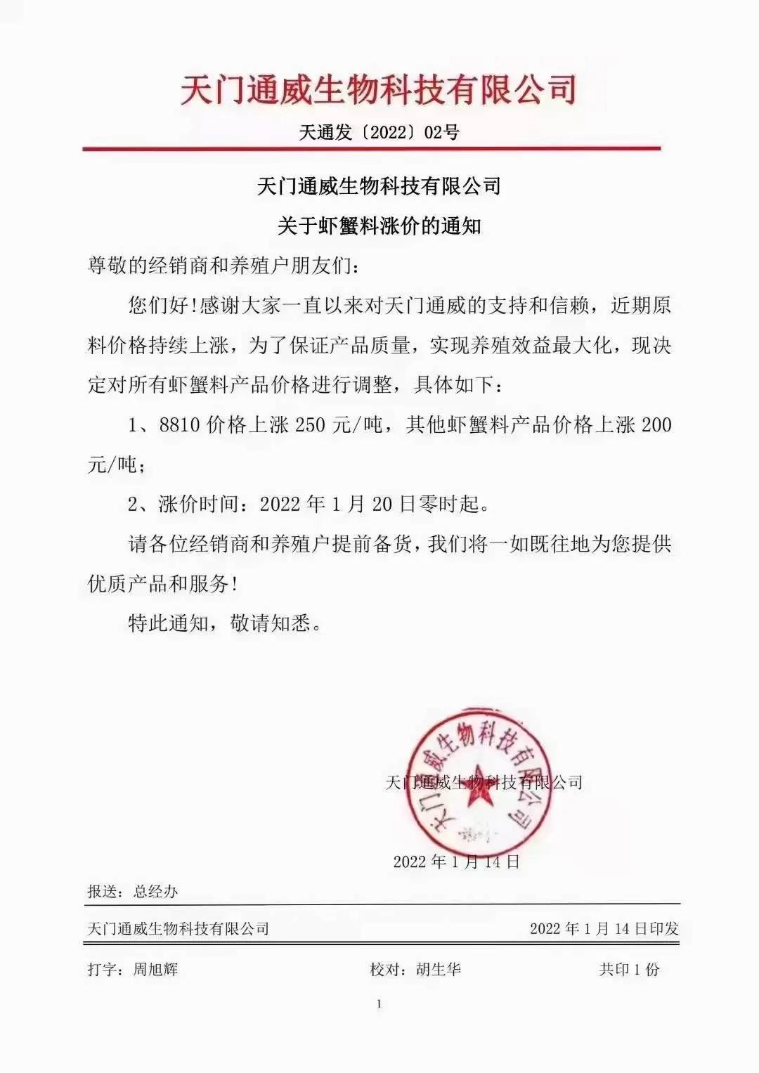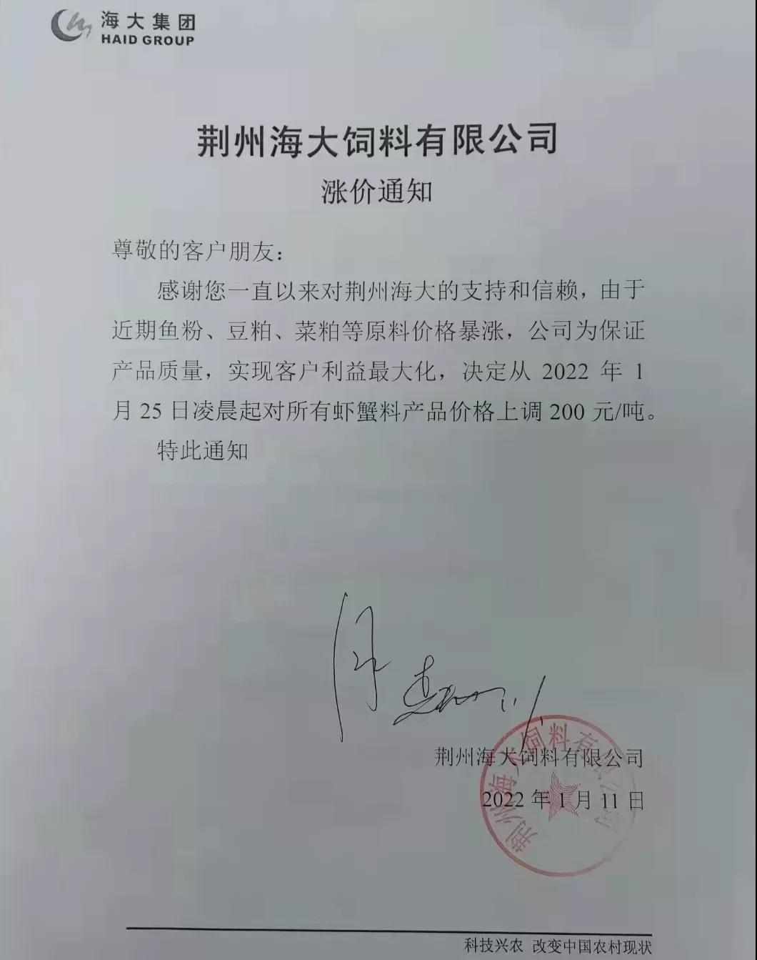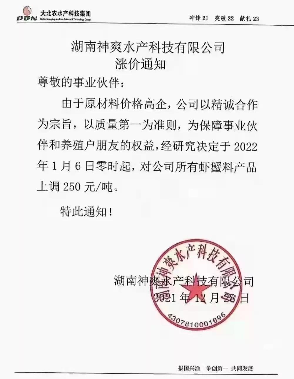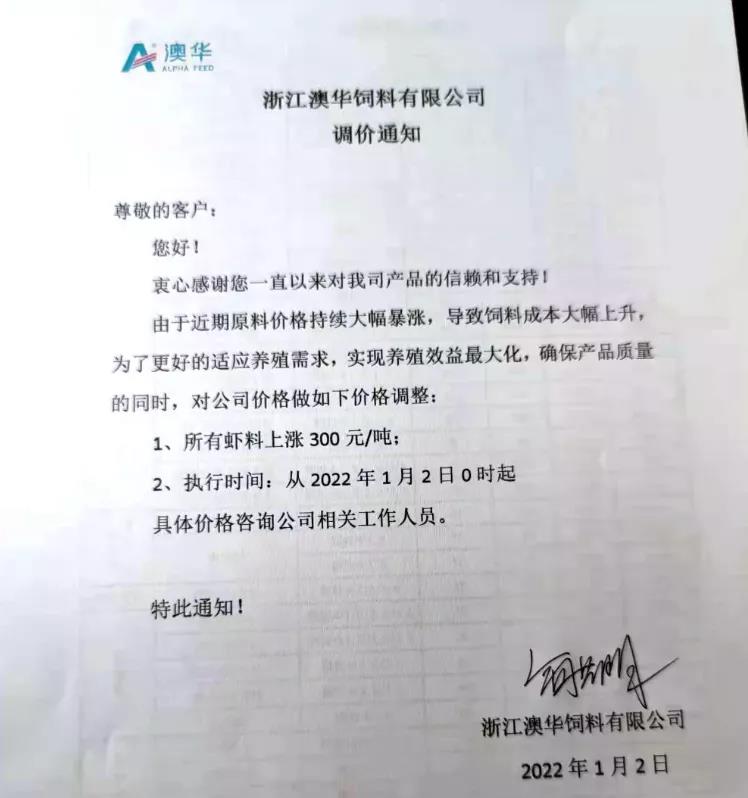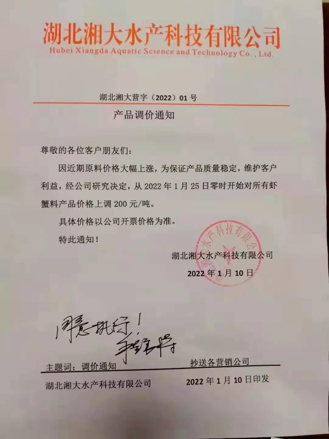 文/ 水產(chǎn)前沿 水產(chǎn)前沿網(wǎng)原創(chuàng)整理報(bào)道,進(jìn)入2022年新年,華東、華中地區(qū)蝦蟹飼料迎來大面積漲價(jià),包括海大、通威、澳華、天馬等多個(gè)飼料集團(tuán)巨頭子公司宣布漲價(jià),漲幅在200-300元/噸。 現(xiàn)階段正值節(jié)前備貨高峰,飼料原料價(jià)格持續(xù)上漲,1月10日豆粕成交價(jià)格為3613.04元/噸,漲至10月底以來的高位。 受原料大漲影響,昨日,珠海海龍、順德旺海、順德鼎一、佛山金浦等多家飼料企業(yè)發(fā)布漲價(jià)通知,加州鱸料上調(diào)200元(約4元/包),華南飼料漲價(jià)潮正式打響。 肇慶高要海大生物科技有限公司漲價(jià)通知 漲價(jià)通知 尊敬的各位經(jīng)銷商、養(yǎng)殖戶朋友: 您們好!感謝您對我司一直以來的鼎力支持,由于原材料價(jià)格持續(xù)高位運(yùn)行,為了確保產(chǎn)品質(zhì)量,實(shí)現(xiàn)養(yǎng)殖效益最大化,經(jīng)公司研究決定,定于2022年1月15日零點(diǎn)起,對產(chǎn)品價(jià)格作如下調(diào)整: 加州鱸料全系列漲價(jià)200元/噸(含鱸生元),即4元/包。 我們將一如既往為您提供優(yōu)質(zhì)產(chǎn)品與服務(wù)! 肇慶高要海大生物科技有限公司 2022年1月15日 珠海海龍生物科技有限公司漲價(jià)通知 順德旺海飼料實(shí)業(yè)有限公司漲價(jià)通知 調(diào)價(jià)通知 尊敬的客戶: 您好!感謝您對我公司的關(guān)心與支持!由于近期原材料價(jià)格持續(xù)大幅上漲,為保證產(chǎn)品質(zhì)量,經(jīng)公司研究決定:從2022年1月15日0:00起,對公司部分產(chǎn)品價(jià)格進(jìn)行調(diào)整: 1、普通加州料、精品加州料、賽冰鮮加州料系列每噸上調(diào)200元(4元/包); 2、其他品種暫不調(diào)價(jià)。 特此通知! 順德旺海飼料實(shí)業(yè)有限公司 2022.1.14 廣東順德鼎一生物科技有限公司漲價(jià)通知 調(diào)價(jià)通知 尊敬的客戶: 您好!感謝您對我公司的關(guān)心與支持!由于近期原材料價(jià)格持續(xù)大幅上漲,為保證產(chǎn)品質(zhì)量,經(jīng)公司研究決定:從2022年1月15日0:00起,對公司部分產(chǎn)品價(jià)格進(jìn)行調(diào)整: 1、加州料系列每噸上調(diào)200元(4元/包); 2、其他品種暫不調(diào)價(jià)。 特此通知! 廣東順德鼎一生物科技有限公司 2022.1.14 佛山市金浦飼料實(shí)業(yè)有限公司漲價(jià)通知 升價(jià)通知 尊敬的各位經(jīng)銷商和養(yǎng)殖戶朋友: 您們好!由于原料價(jià)格大幅度上漲,在確保產(chǎn)品質(zhì)量的前提下對以下品種進(jìn)行價(jià)格調(diào)整,具體調(diào)整如下: 一、調(diào)整時(shí)間:2022年1月15日中午12:00。 二、調(diào)整品種及調(diào)整幅度: 1、加州鱸料上漲200元/噸(即10kg/包升2元/包、20kg/包升4元/包) 2、其它品種價(jià)格保持不變; 特此通知!恭祝商祺! 佛山市金浦飼料實(shí)業(yè)有限公司 2022年1月15日 廣東東騰飼料有限公司漲價(jià)通知 更多漲價(jià)、備貨通知 華中地區(qū)料企漲價(jià)通知 ↓↓↓ 華東地區(qū)料企漲價(jià)通知 ↓↓↓ 備貨通知 ↓↓↓ |