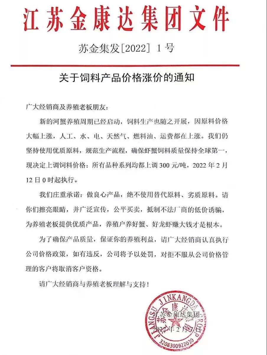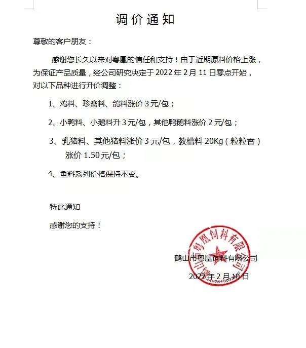 文/ 水產(chǎn)前沿 整理 虎年華南首輪漲價(jià)潮正式來襲!海大、旺海、豐華全線漲,通威立即漲 水產(chǎn)前沿網(wǎng)原創(chuàng)整理報(bào)道,進(jìn)入虎年,飼料原料持續(xù)瘋狂暴漲。很多飼料企業(yè)頂不住,紛紛大漲價(jià)。今天(2月12日),海大集團(tuán)華南蝦特事業(yè)部子公司全線大漲,包括珠海海龍、肇慶高要海大、珠海容川、江門容川、廣州海大、江門新會(huì)奧特等全部漲價(jià),涉及多個(gè)品種飼料,其中包括草魚料、鯉魚料、叉尾料、鯪魚料、羅非料、其他顆粒料、魚大大6#、錢多多2#、禾花鯉、鯇魚料、鳙魚料、魚蝦蟹混養(yǎng)料,淡水魚料、特種料等,漲價(jià)的幅度在150-280元/噸。 旺海飼料、豐華飼料均在今天也發(fā)布明天(2月13日零時(shí)起)漲價(jià)通知,旺海漲價(jià)的品種包括草魚料、鯪魚料、羅非料、四季料、叉尾料、特種魚花料等,每噸上調(diào)200-240元。豐華漲價(jià)的品種有黃顙料、加州鱸料、草魚料、禾花鯉料、羅非料、鯪魚料等,最高漲8元/包。 海大、旺海、豐華等多個(gè)飼料廠已漲價(jià),據(jù)悉通威也計(jì)劃明日發(fā)布漲價(jià)通知。由此可見,虎年華南主要是珠三角地區(qū)漲價(jià)潮已正式來襲。而之前很多一直在觀望中的飼料企業(yè),估計(jì)在行業(yè)頭部料企漲價(jià)壓力下,將會(huì)密切跟進(jìn)。提醒養(yǎng)殖戶、經(jīng)銷商又要抓緊時(shí)間備貨了。 附:最新的料企漲價(jià)通知 江門容川飼料有限公司漲價(jià)通知 漲價(jià)通知 尊敬的合作伙伴、養(yǎng)殖戶朋友: 由于原料價(jià)格持續(xù)上漲,為保證產(chǎn)品質(zhì)量,公司決定從2022年2月12日凌晨開始對(duì)羅非魚及混養(yǎng)料系列進(jìn)行價(jià)格調(diào)整: 1、羅非魚料系列上調(diào)200元/噸。 2、魚蝦蟹混養(yǎng)系列上調(diào)200元/噸。 特此通知! 江門容川飼料有限公司 2022年2月11日 珠海容川飼料有限公司漲價(jià)通知 漲價(jià)通知 尊敬的合作伙伴、養(yǎng)殖戶朋友: 由于原料價(jià)格持續(xù)上漲,為保證產(chǎn)品質(zhì)量,公司決定從2022年2月12日凌晨開始對(duì)羅非魚及混養(yǎng)料系列進(jìn)行價(jià)格調(diào)整: 1、羅非魚料系列上調(diào)200元/噸。 2、魚蝦蟹混養(yǎng)系列上調(diào)200元/噸。 特此通知! 珠海容川飼料有限公司 2022年2月11日 肇慶高要海大生物科技有限公司漲價(jià)通知 廣州海大科技發(fā)展有限公司漲價(jià)通知 江門市新會(huì)區(qū)奧特飼料有限公司漲價(jià)通知 漲價(jià)通知 尊敬的廣大客戶朋友: 由于原材料持續(xù)漲價(jià),為保證產(chǎn)品質(zhì)量,公司決定從2022年2月12日零時(shí)開始對(duì)以下產(chǎn)品進(jìn)行漲價(jià)調(diào)整: 1、草魚膨化料、叉尾料、鯪魚膨化料、鯪魚顆粒料漲200元/噸; 2、羅非膨化料、大草魚料280#、淡水魚料450#漲240元/噸; 3、魚種料290+、鳙魚料漲280元/噸; 4、其它顆粒料漲150元/噸。 特此通知 江門市新會(huì)區(qū)奧特飼料有限公司 2022年2月11日 珠海海龍生物科技有限公司漲價(jià)通知 佛山市順德區(qū)豐華飼料實(shí)業(yè)有限公司漲價(jià)通知 升價(jià)通知 尊敬的客戶: 由于近期原料價(jià)格大幅度上漲,為確保產(chǎn)品質(zhì)量穩(wěn)定,經(jīng)公司研究決定,從2022年02月13日凌晨零時(shí)起,對(duì)以下魚料產(chǎn)品進(jìn)行價(jià)格調(diào)整: 一、調(diào)整品種及價(jià)格: 1、黃顙多樂系列每包升價(jià)3元; 2、加州料系列、叉尾鮰系列(含鮰多寶)每包升價(jià)4元; 3、膨化草魚料系列、禾花鯉系列(含鯉多樂)、花鰱料每包升價(jià)5元; 4、膨化羅非料系列、順華264A、利華264A每包升價(jià)6元; 5、沉水顆粒草魚料系列、顆粒羅非料系列每包升價(jià)6元; 6、鯪魚寶系列、907#、916#每包升價(jià)8元。 7、其它產(chǎn)品價(jià)格不變。 特此通知 佛山市順德區(qū)豐華飼料實(shí)業(yè)有限公司 2022年02月12日 江門市旺海飼料實(shí)業(yè)有限公司漲價(jià)通知 調(diào)價(jià)通知 尊敬的客戶: 您好!感謝您對(duì)我公司的關(guān)心與支持!由于近期原材料價(jià)格持續(xù)大幅上漲,為保證產(chǎn)品質(zhì)量,經(jīng)公司研究決定:從2022年2月13日0:00起,對(duì)公司部分產(chǎn)品價(jià)格進(jìn)行調(diào)整: 1、精品草魚膨化料、鯪魚顆粒料每噸上調(diào)200元。 2、草魚、羅非顆粒料每噸上調(diào)150元。 3、精品羅非膨化料、四季料(含草魚和羅非料)、叉尾料、特種魚花料每噸上調(diào)240元。 特此通知! 江門市旺海飼料實(shí)業(yè)有限公司 2022.2.12 通威拜歐瑪(無錫)生物科技有限公司漲價(jià)通知 江蘇金康達(dá)飼料漲價(jià)通知 更多畜禽料上漲消息 廣州市大川飼料有限公司漲價(jià)通知 升價(jià)通知 因部分原材料價(jià)格變動(dòng),經(jīng)海大集團(tuán)公司研究決定,廣州市大川飼料有限公司定于2022年2月10日24:00起對(duì)以下產(chǎn)品進(jìn)行價(jià)格調(diào)整: 1,小鴨料、小鵝料上調(diào)3元/包。 2,蛋鴨料、肉鴨料、鵝料上調(diào)2元/包。 感謝客戶支持,順祝商祺! 升價(jià)通知 尊敬的客戶: 由于近期部分原材料價(jià)格爆漲,造成產(chǎn)品成本不斷增加,為保證產(chǎn)品質(zhì)量的穩(wěn)定,經(jīng)公司研究決定,于2022年2月11日早上7:30起,調(diào)整以下產(chǎn)品價(jià)格: 1、小鴨料升價(jià)3