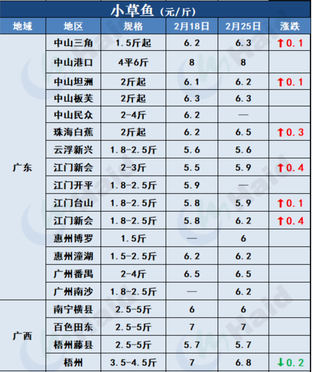 文 | 圖 海大魚樂圈 水產(chǎn)前沿網(wǎng)報(bào)道,草魚種:廣東中山黃圃由于幾天連續(xù)降雨,氣溫急劇下降,魚價(jià)開始有所回升,目前3-7兩可以有6元/斤塊,后期還有上升空間。而中山大涌隨著后續(xù)外省升溫,抓魚需求逐漸上漲,價(jià)格成上漲趨勢(shì);養(yǎng)殖戶目前普遍惜賣,想等待魚價(jià)繼續(xù)上漲;葜莶┝_因天氣回暖,客戶投苗增加,價(jià)格也有所提升。 小草魚:廣東中山坦洲目前客戶存塘量大,出魚意愿強(qiáng),都想趁行情好,陸續(xù)出魚,預(yù)計(jì)草魚較好價(jià)格行情可以持續(xù)到清明后;目前天氣轉(zhuǎn)暖,客戶開始增加投喂量,博清明前后的魚價(jià)出魚。中山港口價(jià)錢跟隨5平7斤走勢(shì),目前這手魚較少出售,價(jià)錢依舊持相對(duì)高位。廣州南沙受低溫天氣影響,抓魚減少,價(jià)格上漲;天氣轉(zhuǎn)暖后,價(jià)格回落。廣西梧州當(dāng)前中鯇存塘量還是比較高,中鯇消費(fèi)量不大。湖南益陽沅江存塘魚不到50%,而常德因氣溫上升,出魚加快,市場(chǎng)價(jià)格出現(xiàn)震蕩下行;隨著后期存塘減少,預(yù)計(jì)價(jià)格會(huì)有上浮。湖北仙桃存塘減少,加上原材料飛漲,魚價(jià)小幅上升。江蘇射陽草魚價(jià)格上漲,主要原因是客戶惜售,出魚量小。 大草魚:廣東中山港口年后脆肉鯇出魚量大,空塘補(bǔ)苗需求大,養(yǎng)殖戶存塘惜售。廣西梧州5斤以上草魚存塘量不多,價(jià)格有所上漲。湖南岳陽中洲大草魚平8斤塘頭價(jià)格7.8元/斤。湖北武漢價(jià)格比較平穩(wěn),5-8斤草魚,價(jià)格在6-7元/斤之間。 |