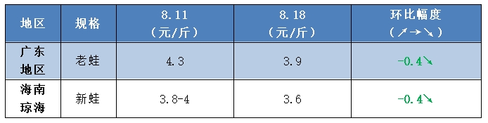 | 水產(chǎn)前沿網(wǎng)原創(chuàng)報(bào)道, 牛蛙行情 明日牛蛙主流廠(chǎng)家報(bào)價(jià)不一,以廣寶為主等廠(chǎng)家報(bào)價(jià)5.2-6.0元/斤,比上周同期下調(diào)了0.1-0.5元/斤,而源信為主等廠(chǎng)家依然維持在5.2-6.5元/斤。 目前華中過(guò)冬蛙大概還有三四成,預(yù)計(jì)要到九月份才能出完。新蛙方面海南、粵西新蛙早已上市,廣東臺(tái)山、廣西的蛙規(guī)格也逐漸起來(lái)了。新老蛙同時(shí)上市“撞車(chē)”導(dǎo)致暑期蛙價(jià)不漲反跌。 另一方面,老蛙由于存塘量大和養(yǎng)戶(hù)惜售等原因一直到現(xiàn)在都還沒(méi)出完,也影響到了早蛙的出貨節(jié)奏,早蛙壓在塘里規(guī)格不斷增大,產(chǎn)量也逐漸增多。九月之后暑期結(jié)束消費(fèi)需求也將進(jìn)一步下降,業(yè)內(nèi)人士表示后市行情并不明朗,只能寄希望于中秋和國(guó)慶假期。 泰蛙行情 泰蛙方面,由于存塘量大以及受到牛蛙跌價(jià)的沖擊,本周蛙價(jià)再次回落。 黑斑蛙行情 黑斑蛙方面,隨著各地新蛙上市量越來(lái)越多,目前市場(chǎng)價(jià)格也卷的很厲害,個(gè)別市場(chǎng)硬七起、硬八起規(guī)格的蛙批發(fā)價(jià)格甚至在個(gè)位數(shù)。當(dāng)前正處于新蛙上市高峰期,蛙價(jià)預(yù)計(jì)還將持續(xù)低迷一段時(shí)間。 |
