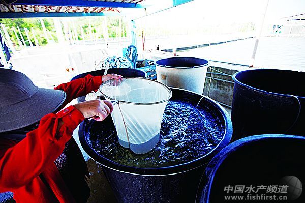 八九年錢(qián)實(shí)現(xiàn)人工繁育 曾經(jīng)出海捕魚(yú)的佳冬鄉(xiāng)金鐘魚(yú)養(yǎng)殖戶(hù)林春輝接受本刊專(zhuān)訪時(shí)表示,以前野生金鐘魚(yú)捕獲量不是特別多,加上肉質(zhì)細(xì)致,市場(chǎng)售價(jià)高達(dá)一臺(tái)斤500元,當(dāng)時(shí)就對(duì)這條魚(yú)特別有興趣,并把較大的魚(yú)留下來(lái)飼養(yǎng),研究人工繁殖技術(shù)。經(jīng)多年的觀察及嘗試,大約在8-9年前,總算摸熟了金鐘魚(yú)的繁殖技術(shù),開(kāi)始大量養(yǎng)殖金鐘魚(yú)。 林春輝說(shuō),剛開(kāi)始對(duì)這條魚(yú)各方面的習(xí)性完全不了解,最早使用鰻魚(yú)粉狀飼料投餌,但是都養(yǎng)不起來(lái)。后來(lái)觀察發(fā)現(xiàn),金鐘嘴巴很小,吃餌是用吸的,鰻粉投下后都溶解散失,金鐘魚(yú)吃不到餌,池子里的金鐘魚(yú)養(yǎng)不起來(lái),原來(lái)都是餓死了。后來(lái)改用蝦料,情況已經(jīng)有些改善,但效果仍然不是很理想。最后改用石斑魚(yú)飼料,并把顆粒做得更細(xì)一些,這才解決了金鐘的餌料問(wèn)題。 現(xiàn)在,林春輝的池子里一直維持?jǐn)?shù)千斤的種魚(yú),作為生產(chǎn)受精卵用,這些種魚(yú)可以使用3-4年才淘汰,平均每尾在10兩到1臺(tái)斤(編注:臺(tái)灣1兩為37.5克,1臺(tái)斤為600克)。池里種魚(yú)沒(méi)有特別公母比例,每年土地公生(農(nóng)歷2月初2)到西歷10月底是繁殖季節(jié),這段時(shí)間里,幾乎每天都有受精卵可以收集,和其他海水魚(yú)類(lèi)一樣,大潮前后產(chǎn)卵量比較多。母魚(yú)多在夜間產(chǎn)卵,收集后放入0.5噸的FRP桶做處理,天亮后移入小池孵化育苗。 受精卵孵化后約35-40天養(yǎng)到指甲大小的幼苗就可出售放養(yǎng)到大池了。林春輝說(shuō),受精卵除了以每公斤1萬(wàn)元出售以外,也有免費(fèi)供應(yīng)給育苗業(yè)者培育,育出的幼苗三七分,林春輝取回3成魚(yú)苗作為自家養(yǎng)殖用。