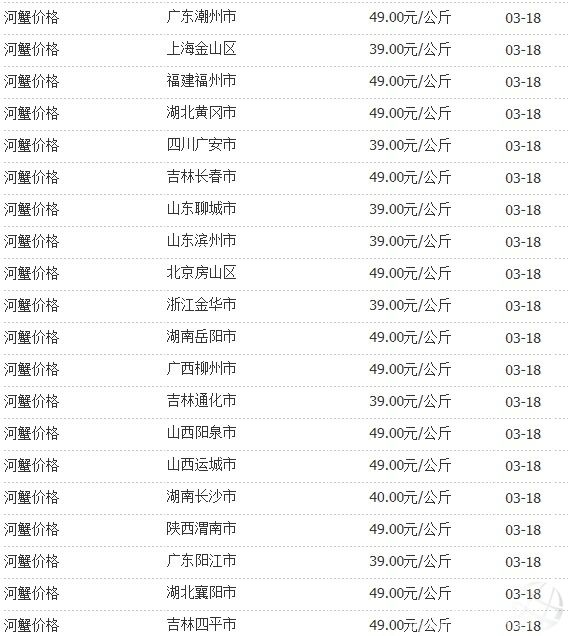 3月18日國內(nèi)部分地區(qū)河蟹價格統(tǒng)計