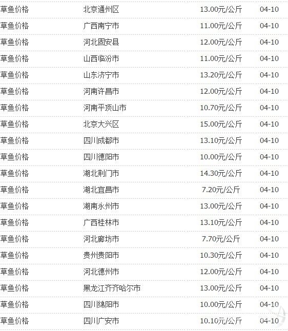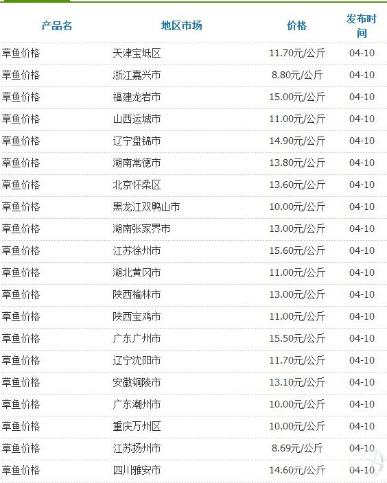 4月10日國內(nèi)部分地區(qū)草魚價格統(tǒng)計