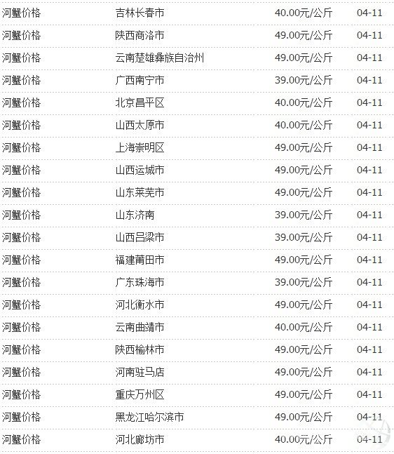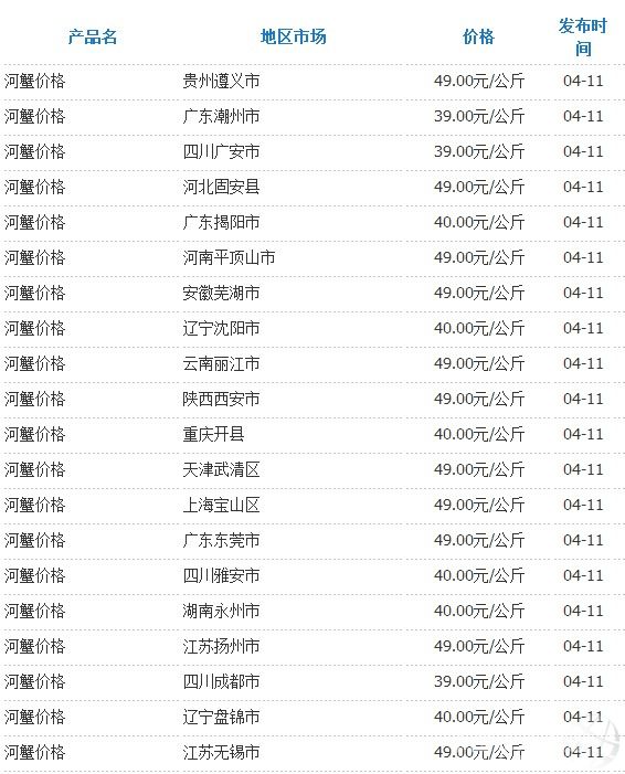 4月11日國(guó)內(nèi)部分地區(qū)河蟹價(jià)格統(tǒng)計(jì)