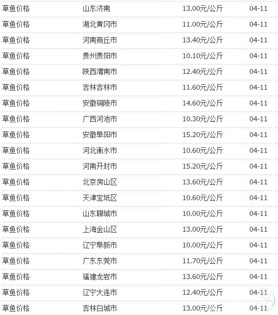 4月11日國內(nèi)部分地區(qū)草魚價格統(tǒng)計