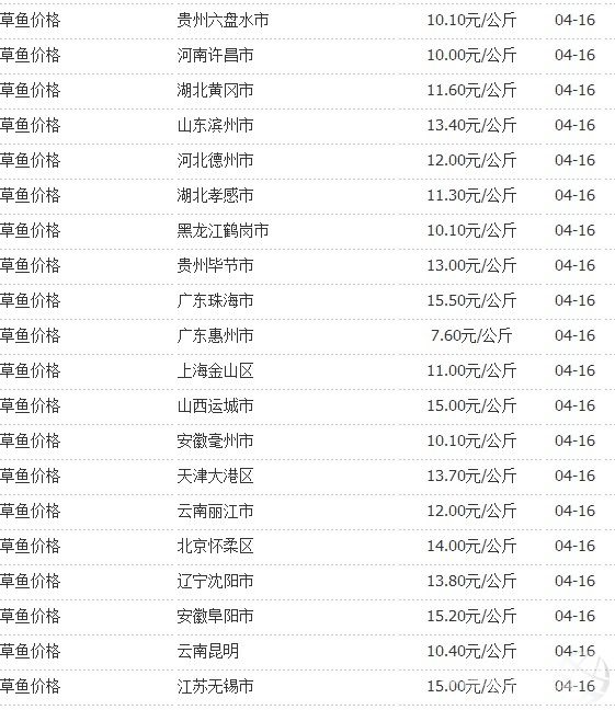 中國(guó)水產(chǎn)頻道獨(dú)家報(bào)道,4月16日國(guó)內(nèi)部分地區(qū)草魚(yú)價(jià)格統(tǒng)計(jì)如下: