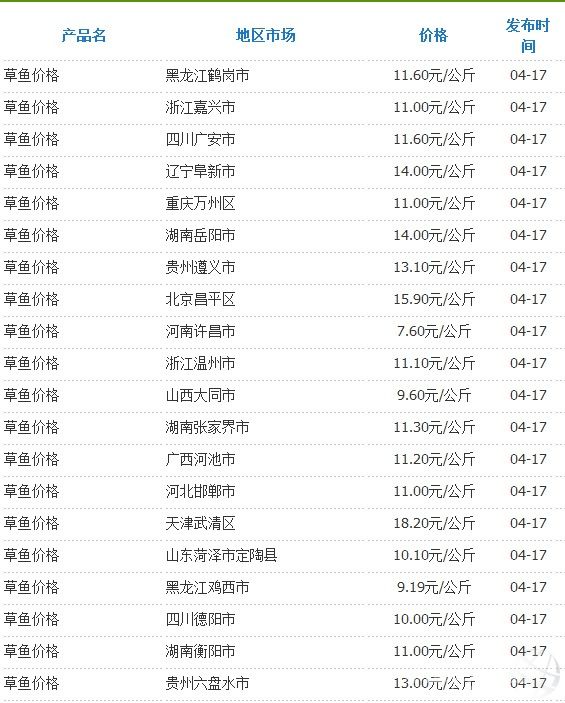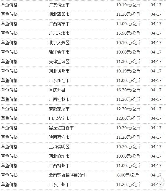 4月17日國(guó)內(nèi)部分地區(qū)草魚(yú)價(jià)格統(tǒng)計(jì)
