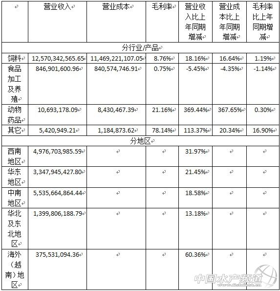 來(lái)源:海大集團(tuán)2012年年度報(bào)告 通威股份2012年主營(yíng)業(yè)務(wù)構(gòu)成情況(單位:元) 來(lái)源:通威股份2012年年度報(bào)告
