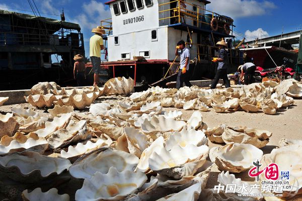 從黃巖島歸來的漁船正在卸下硨磲殼