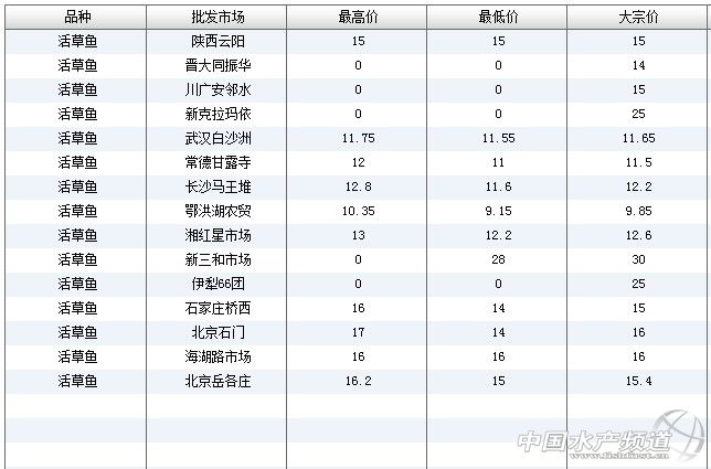 中國(guó)水產(chǎn)頻道獨(dú)家報(bào)道,6月8日全國(guó)主要批發(fā)市場(chǎng)草魚價(jià)格行情如下: