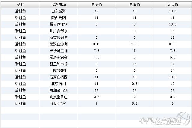 中國水產(chǎn)頻道獨(dú)家報(bào)道,6月8日全國主要批發(fā)市場鯉魚價(jià)格行情如下: