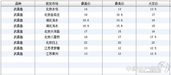 中國(guó)水產(chǎn)頻道獨(dú)家報(bào)道,6月9日全國(guó)主要批發(fā)市場(chǎng)武昌魚(yú)價(jià)格行情如下:
