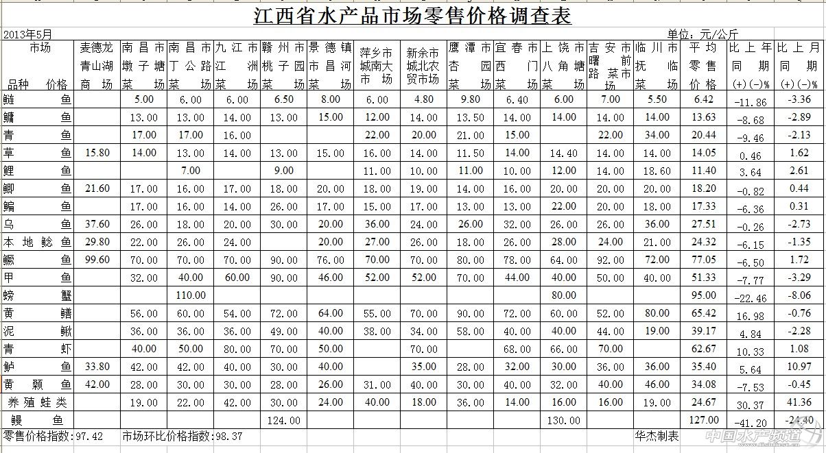 1、市場(chǎng)零售價(jià)格:通過對(duì)江西省14個(gè)水產(chǎn)品零售市場(chǎng)19個(gè)水產(chǎn)養(yǎng)殖品種的調(diào)查,2013年5月份江西水產(chǎn)品市場(chǎng)零售同比價(jià)格指數(shù)為97.42,較上年同期下跌2.58%;環(huán)比價(jià)格指數(shù)為98.37,較上月下跌1.63%。與上年同期相比,列同比跌幅前5位的品種是:鰻魚127.00元/公斤,跌41.20%;河蟹95.00元/公斤,跌22.45%;鰱魚6.42元/公斤,跌11.86%;青魚20.44元/公斤,跌9.46%;鳙魚13.63元/公斤,跌8.68%(詳見附表)。 2、市場(chǎng)批發(fā)價(jià)格:通過對(duì)江西省內(nèi)三個(gè)部級(jí)定點(diǎn)價(jià)格采集批發(fā)市場(chǎng)及二個(gè)省級(jí)定點(diǎn)價(jià)格采集批發(fā)市場(chǎng)共16個(gè)水產(chǎn)養(yǎng)殖品種的價(jià)格采集,2013年5月,江西省水產(chǎn)品批發(fā)價(jià)格指數(shù)為106.06,同比漲幅為6.06%;環(huán)比價(jià)格指數(shù)為104.35,環(huán)比漲4.35。與去年同期相比,列漲幅前五位的是:牛蛙19.75元/公斤,漲88.10%;青魚17.00元/公斤,漲11.11%;泥鰍31.00元/公斤,漲10.71%;鯰魚21.50元/公斤,漲8.86%;鯉魚7.63元/公斤,漲8.00%(詳見附表)。