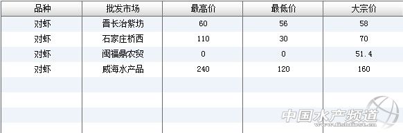 中國(guó)水產(chǎn)頻道獨(dú)家報(bào)道,6月25日全國(guó)主要批發(fā)市場(chǎng)對(duì)蝦價(jià)格行情如下: