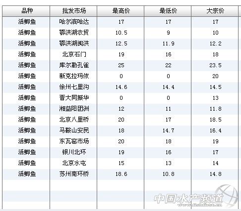 | 中國水產(chǎn)頻道獨(dú)家報(bào)道,7月3日全國主要批發(fā)市場(chǎng)活鯽魚價(jià)格行情如下: (中國水產(chǎn)頻道水產(chǎn)價(jià)格信息共享Q群:245296163,歡迎提供各種水產(chǎn)品一線價(jià)格信息!) 中國水產(chǎn)頻道(www.szsfz.cn)獨(dú)家報(bào)道,轉(zhuǎn)載請(qǐng)說明出處,違者追究法律責(zé)任, 謝謝合作。 |