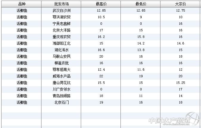 | 中國水產(chǎn)頻道獨家報道,7月9日全國主要批發(fā)市場活鯽魚價格行情如下: (中國水產(chǎn)頻道水產(chǎn)價格信息共享Q群:245296163,歡迎提供各種水產(chǎn)品一線價格信息。 |