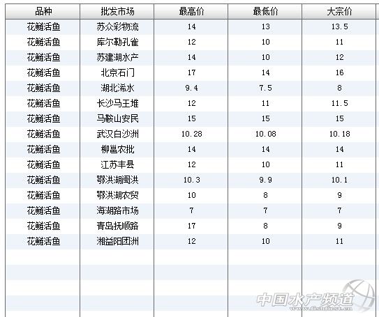 | 中國(guó)水產(chǎn)頻道獨(dú)家報(bào)道,7月15日全國(guó)主要批發(fā)市場(chǎng)花鰱活魚(yú)價(jià)格行情如下: