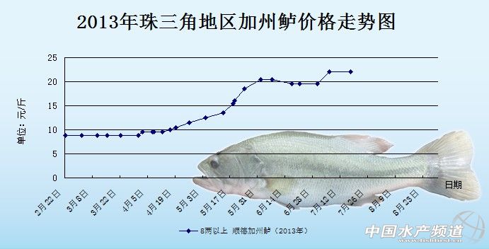 中國水產(chǎn)頻道獨家報道,據(jù)海大集團華南魚料部提供資料顯示,7月6日-18日珠三角地區(qū)加州鱸價格情況如圖所示:
