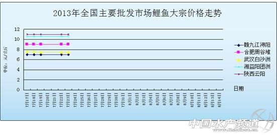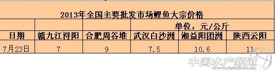 | 中國水產(chǎn)頻道獨家報道,7月23日全國主要批發(fā)市場鯉魚價格行情如下: (中國水產(chǎn)頻道水產(chǎn)價格信息共享Q群:245296163,歡迎提供各種水產(chǎn)品一線價格信息。 |