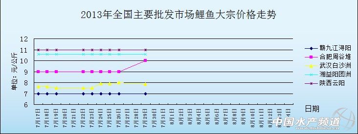 中國水產頻道獨家報道,7月29日全國主要批發(fā)市場鯉魚價格行情如下: