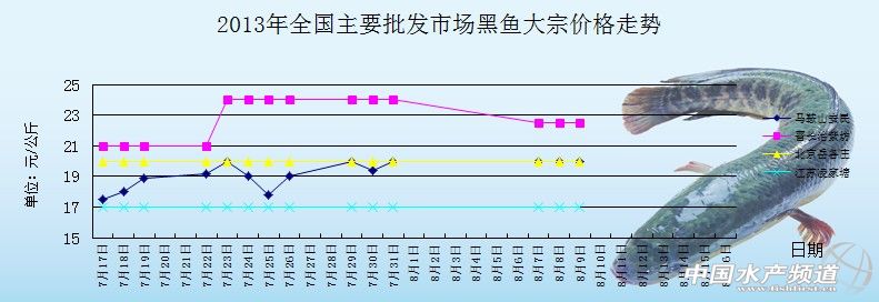 中國(guó)水產(chǎn)頻道獨(dú)家報(bào)道, 8月9日全國(guó)主要批發(fā)市場(chǎng)黑魚(yú)價(jià)格行情如下: