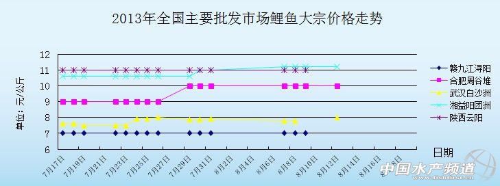 中國水產(chǎn)頻道獨家報道,8月12日全國主要批發(fā)市場鯉魚價格行情如下:
