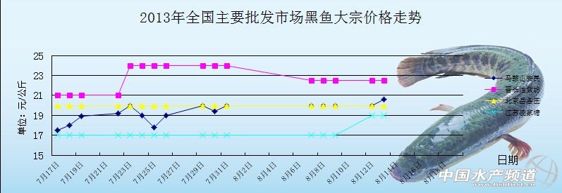 中國水產(chǎn)頻道獨家報道, 8月13日全國主要批發(fā)市場黑魚價格行情如下: 全國主要批發(fā)市場大宗價格 日期 產(chǎn)品 批發(fā)市場 大宗價格 單位 8月13日 黑魚 江蘇建湖水產(chǎn) 26 元/公斤 8月13日 黑魚 江蘇豐縣 19 元/公斤 8月13日 黑魚 江蘇徐州七里溝 17.5 元/公斤 8月13日 黑魚 江蘇常州 19 元/公斤 8月13日 黑魚 江蘇蘇州南環(huán)橋 17.8 元/公斤 8月13日 黑魚 北京大洋路 15 元/公斤 8月13日 黑魚 北京岳各莊 20 元/公斤 8月13日 黑魚 北京新發(fā)地 16.5 元/公斤 8月13日 黑魚 北京水屯 21 元/公斤 8月13日 黑魚 北京城北回龍觀 24 元/公斤 8月13日 黑魚 山西長治紫坊 22.5 元/公斤 8月13日 黑魚 安徽馬鞍山安民 20.6 元/公斤 8月12日 黑魚 江蘇建湖水產(chǎn) 26 元/公斤 8月12日 黑魚 江蘇豐縣 19 元/公斤 8月12日 黑魚 江蘇徐州七里溝 17.5 元/公斤 8月12日 黑魚 江蘇常州 19 元/公斤 8月12日 黑魚 江蘇蘇州南環(huán)橋 17.8 元/公斤 (中國水產(chǎn)頻道水產(chǎn)價格信息共享Q群:245296163,歡迎提供各種水產(chǎn)品一線價格信息。 中國水產(chǎn)頻道(www.szsfz.cn)獨家報道,轉(zhuǎn)載請說明出處,違者追究法律責(zé)任, 謝謝合作。 | |||||||||||||||||||||||||||||||||||||||||||||||||||||||||||||||||||||||||||||||||||||||||||||||