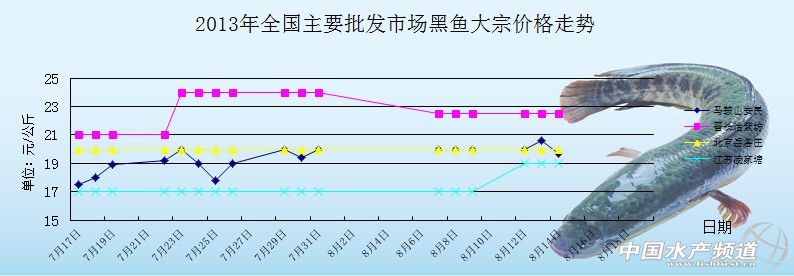 中國水產(chǎn)頻道獨家報道, 8月14日全國主要批發(fā)市場黑魚價格行情如下: 全國主要批發(fā)市場大宗價格 日期 產(chǎn)品 批發(fā)市場 大宗價格 單位 8月14日 黑魚 江蘇建湖水產(chǎn) 26 元/公斤 8月14日 黑魚 江蘇豐縣 19 元/公斤 8月14日 黑魚 江蘇徐州七里溝 17.5 元/公斤 8月14日 黑魚 江蘇常州 19 元/公斤 8月14日 黑魚 江蘇蘇州南環(huán)橋 17.5 元/公斤 8月14日 黑魚 北京大洋路 15 元/公斤 8月14日 黑魚 北京岳各莊 20 元/公斤 8月14日 黑魚 北京新發(fā)地 16.5 元/公斤 8月14日 黑魚 北京水屯 21 元/公斤 8月14日 黑魚 北京城北回龍觀 24 元/公斤 8月14日 黑魚 山西長治紫坊 22.5 元/公斤 8月14日 黑魚 安徽馬鞍山安民 19.7 元/公斤 8月13日 黑魚 江蘇建湖水產(chǎn) 26 元/公斤 8月13日 黑魚 江蘇豐縣 19 元/公斤 8月13日 黑魚 江蘇徐州七里溝 17.5 元/公斤 8月13日 黑魚 江蘇常州 19 元/公斤 8月13日 黑魚 江蘇蘇州南環(huán)橋 17.8 元/公斤 (中國水產(chǎn)頻道水產(chǎn)價格信息共享Q群:245296163,歡迎提供各種水產(chǎn)品一線價格信息。 中國水產(chǎn)頻道(www.szsfz.cn)獨家報道,轉(zhuǎn)載請說明出處,違者追究法律責任, 謝謝合作。 | |||||||||||||||||||||||||||||||||||||||||||||||||||||||||||||||||||||||||||||||||||||||||||||||