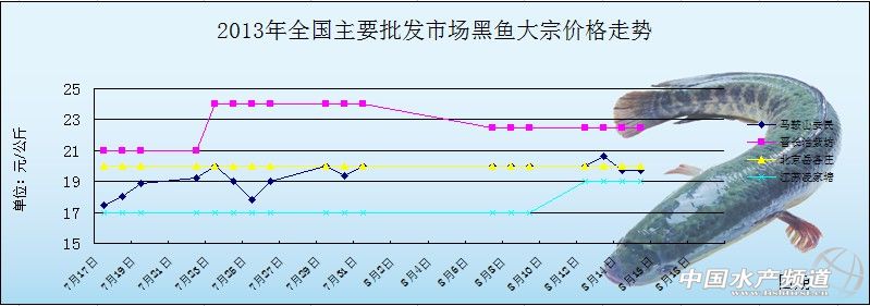 中國水產(chǎn)頻道獨家報道, 8月15日全國主要批發(fā)市場黑魚價格行情如下: 全國主要批發(fā)市場大宗價格 日期 產(chǎn)品 批發(fā)市場 大宗價格 單位 黑魚 江蘇建湖水產(chǎn) 26 元/公斤 黑魚 江蘇豐縣 19 元/公斤 黑魚 江蘇徐州七里溝 17.5 元/公斤 黑魚 江蘇常州 19 元/公斤 黑魚 江蘇蘇州南環(huán)橋 18.5 元/公斤 黑魚 北京大洋路 15 元/公斤 黑魚 北京岳各莊 20 元/公斤 黑魚 北京新發(fā)地 16.5 元/公斤 黑魚 北京水屯 21 元/公斤 黑魚 北京城北回龍觀 24 元/公斤 黑魚 山西長治紫坊 22.5 元/公斤 黑魚 安徽馬鞍山安民 19.7 元/公斤 黑魚 江蘇建湖水產(chǎn) 26 元/公斤 黑魚 江蘇豐縣 19 元/公斤 黑魚 江蘇徐州七里溝 17.5 元/公斤 (中國水產(chǎn)頻道水產(chǎn)價格信息共享Q群:245296163,歡迎提供各種水產(chǎn)品一線價格信息。 中國水產(chǎn)頻道(www.szsfz.cn)獨家報道,轉(zhuǎn)載請說明出處,違者追究法律責(zé)任, 謝謝合作。 | |||||||||||||||||||||||||||||||||||||||||||||||||||||||||||||||||||||||||||||||||||||