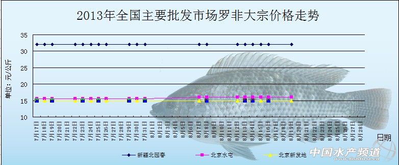中國水產(chǎn)頻道獨家報道,8月19日全國主要批發(fā)市場羅非魚價格行情如下: 全國主要批發(fā)市場大宗價格 日期 產(chǎn)品 批發(fā)市場 大宗價格 趨勢 單位 羅非魚 新疆北園春 32 元/公斤 羅非魚 北京新發(fā)地 15 元/公斤 羅非魚 北京水屯 16 元/公斤 羅非魚 新疆北園春 32 元/公斤 羅非魚 北京新發(fā)地 15 元/公斤 羅非魚 北京水屯 16 元/公斤 羅非魚 新疆北園春 32 元/公斤 羅非魚 北京新發(fā)地 15 元/公斤 羅非魚 北京水屯 16 元/公斤 羅非魚 新疆北園春 32 元/公斤 羅非魚 北京新發(fā)地 15 元/公斤 羅非魚 北京水屯 16 元/公斤 羅非魚 新疆北園春 32 元/公斤 羅非魚 北京新發(fā)地 15 元/公斤 羅非魚 北京水屯 16 元/公斤 (中國水產(chǎn)頻道水產(chǎn)價格信息共享Q群:245296163,歡迎提供各種水產(chǎn)品一線價格信息!) | ||||||||||||||||||||||||||||||||||||||||||||||||||||||||||||||||||||||||||||||||||||||||||||||||||||||
