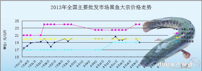 中國水產(chǎn)頻道獨(dú)家報道, 8月20日全國主要批發(fā)市場黑魚價格行情如下: 全國主要批發(fā)市場大宗價格 日期 產(chǎn)品 批發(fā)市場 大宗價格 趨勢 單位 黑魚 江蘇凌家塘 19 元/公斤 黑魚 江蘇建湖水產(chǎn) 26 元/公斤 黑魚 江蘇豐縣 19 元/公斤 黑魚 江蘇徐州七里溝 17.5 元/公斤 黑魚 江蘇常州 19 元/公斤 黑魚 江蘇蘇州南環(huán)橋 18.5 元/公斤 黑魚 北京大洋路 15 元/公斤 黑魚 北京岳各莊 20 元/公斤 黑魚 北京新發(fā)地 21 元/公斤 黑魚 北京水屯 21 元/公斤 黑魚 北京城北回龍觀 24 元/公斤 黑魚 山西長治紫坊 24 元/公斤 黑魚 安徽馬鞍山安民 19 ↓ 元/公斤 黑魚 江蘇凌家塘 19 元/公斤 黑魚 江蘇建湖水產(chǎn) 26 元/公斤 (中國水產(chǎn)頻道水產(chǎn)價格信息共享Q群:245296163,歡迎提供各種水產(chǎn)品一線價格信息。 中國水產(chǎn)頻道(www.szsfz.cn)獨(dú)家報道,轉(zhuǎn)載請說明出處,違者追究法律責(zé)任, 謝謝合作。 | ||||||||||||||||||||||||||||||||||||||||||||||||||||||||||||||||||||||||||||||||||||||||||||||||||||||