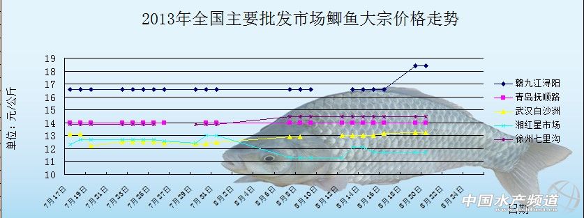 中國(guó)水產(chǎn)頻道獨(dú)家報(bào)道, 8月20日全國(guó)主要批發(fā)市場(chǎng)鯽魚價(jià)格行情如下: 全國(guó)主要批發(fā)市場(chǎng)大宗價(jià)格 日期 產(chǎn)品 批發(fā)市場(chǎng) 大宗價(jià)格 趨勢(shì) 單位 鯽魚 江西九江潯陽(yáng) 18.4 元/公斤 鯽魚 湖北浠水 15 元/公斤 鯽魚 湖北武漢白沙洲 13.23 元/公斤 鯽魚 江蘇凌家塘 18 元/公斤 鯽魚 江蘇徐州七里溝 14.5 元/公斤 鯽魚 山東威海水產(chǎn)品 22 元/公斤 鯽魚 山東青島撫順路 14 元/公斤 鯽魚 山西大同振華 13 元/公斤 鯽魚 重慶觀農(nóng)貿(mào) 16 元/公斤 鯽魚 四川廣安鄰水 17 元/公斤 鯽魚 安徽馬鞍山安民 16.8 ↑ 元/公斤 鯽魚 安徽合肥周谷堆 15.3 元/公斤 鯽魚 湖南益陽(yáng)團(tuán)洲 11.5 元/公斤 鯽魚 湖南長(zhǎng)沙馬王堆 12.5 元/公斤 鯽魚 湖南紅星市場(chǎng) 12 元/公斤 (中國(guó)水產(chǎn)頻道水產(chǎn)價(jià)格信息共享Q群:245296163,歡迎提供各種水產(chǎn)品一線價(jià)格信息!) | ||||||||||||||||||||||||||||||||||||||||||||||||||||||||||||||||||||||||||||||||||||||||||||||||||||||