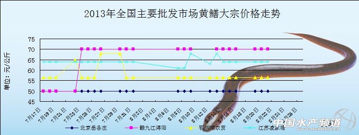 中國水產(chǎn)頻道獨(dú)家報(bào)道, 8月21日全國主要批發(fā)市場(chǎng)黃鱔價(jià)格行情如下: 全國主要批發(fā)市場(chǎng)大宗價(jià)格 日期 產(chǎn)品 批發(fā)市場(chǎng) 大宗價(jià)格 趨勢(shì) 單位 黃鱔 威海水產(chǎn)品 64 元/公斤 黃鱔 湖北洪湖閩洪 68 元/公斤 黃鱔 湖北洪湖農(nóng)貿(mào) 56.5 元/公斤 黃鱔 江蘇凌家塘 64 元/公斤 黃鱔 江蘇常州 64 元/公斤 黃鱔 江蘇蘇州南環(huán)橋 66 元/公斤 黃鱔 北京大洋路 36 元/公斤 黃鱔 北京岳各莊 50 元/公斤 黃鱔 北京新發(fā)地 75 元/公斤 黃鱔 北京八里橋 55 元/公斤 黃鱔 北京城北回龍觀 54 元/公斤 黃鱔 江西九江潯陽 70 元/公斤 黃鱔 福建福鼎農(nóng)貿(mào) 36.2 ↓ 元/公斤 黃鱔 新疆北園春 58 元/公斤 黃鱔 江西九江潯陽 70 元/公斤 中國水產(chǎn)頻道水產(chǎn)價(jià)格信息共享Q群:245296163,歡迎提供各種水產(chǎn)品一線價(jià)格信息。 | ||||||||||||||||||||||||||||||||||||||||||||||||||||||||||||||||||||||||||||||||||||||||||||||||||||||