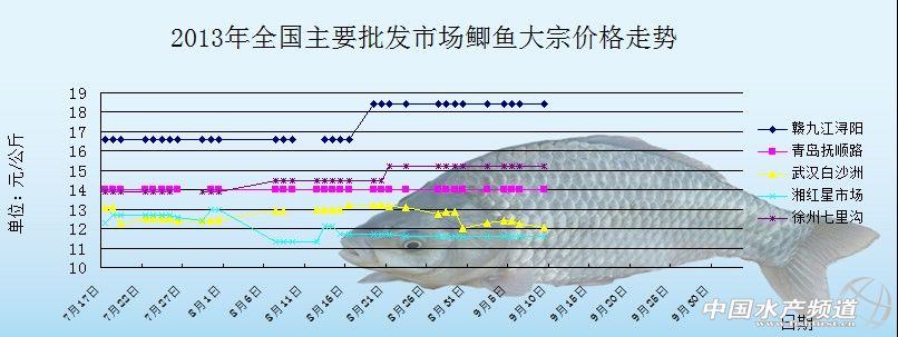 中國(guó)水產(chǎn)頻道獨(dú)家報(bào)道, 9月13日全國(guó)主要批發(fā)市場(chǎng)鯽魚價(jià)格行情如下: