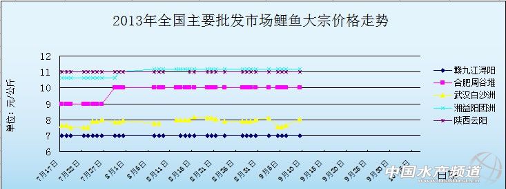 中國(guó)水產(chǎn)頻道獨(dú)家報(bào)道,9月13日全國(guó)主要批發(fā)市場(chǎng)鯉魚價(jià)格行情如下:
