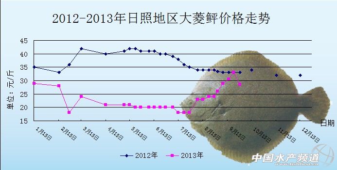 中國水產(chǎn)頻道獨家報道,據(jù)青島七好生物科技有限公司提供資料顯示,2013年9月30日,山東日照地區(qū)大菱鲆塘頭報價為28.5元/斤,較上周下滑3.5元/斤,由于節(jié)后消費回復(fù),價格也隨之下降。