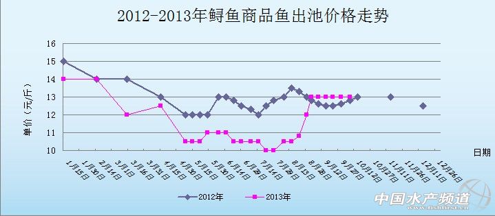 中國水產(chǎn)頻道獨(dú)家報(bào)道,據(jù)青島七好生物科技有限公司提供資料顯示,2013年10月8日,山東冶原地區(qū)鱘魚塘頭報(bào)價為13元/斤,與上周持平。