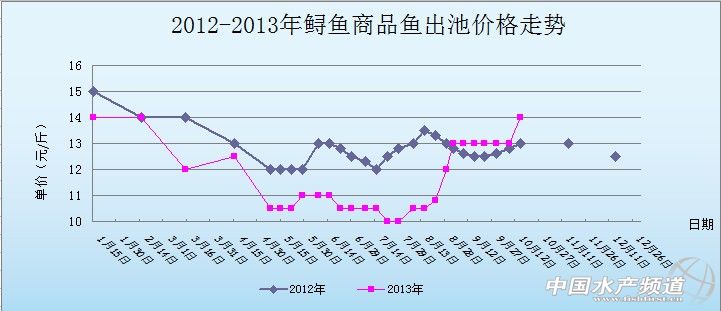 中國水產(chǎn)頻道獨(dú)家報(bào)道,據(jù)青島七好生物科技有限公司提供資料顯示,2013年10月14日,山東冶原地區(qū)鱘魚塘頭報(bào)價(jià)為14元/斤,較上周上漲1元/斤。