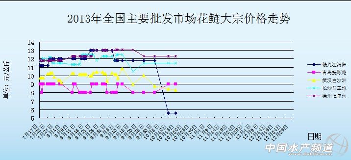 中國(guó)水產(chǎn)頻道獨(dú)家報(bào)道,10月14日全國(guó)主要批發(fā)市場(chǎng)花鰱價(jià)格行情如下: