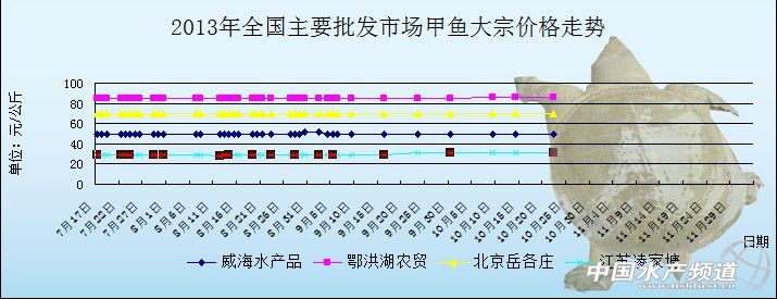 中國水產(chǎn)頻道獨(dú)家報(bào)道,10月25日全國主要批發(fā)市場甲魚價(jià)格行情如下: