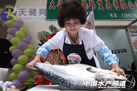 店家現(xiàn)場(chǎng)展示來自挪威空運(yùn)的新鮮三文魚