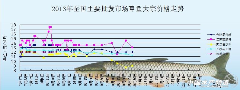 中國水產(chǎn)頻道報道,2013年11月14日國內(nèi)水產(chǎn)品批發(fā)市場草魚價格行情如下: