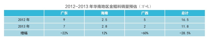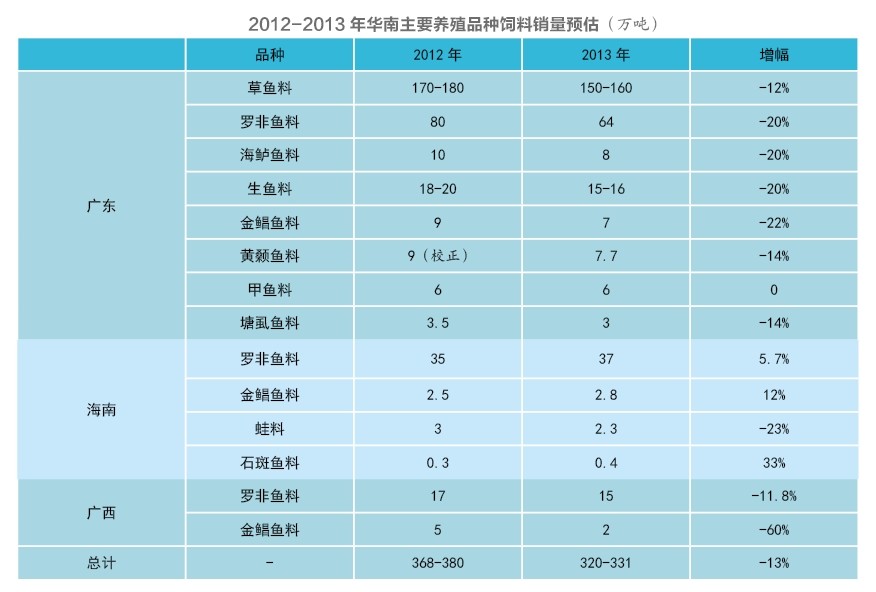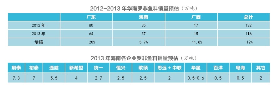 本文對2013年華南地區(qū)主要養(yǎng)殖品種飼料市場銷量做了大體統(tǒng)計,僅供參考。 文/ 中國水產(chǎn)頻道 唐東東整理 部分養(yǎng)殖品種延續(xù)2012年的低迷行情,再加上養(yǎng)殖成本的上漲,養(yǎng)殖盈利空間進(jìn)一步被壓縮;除此之外,復(fù)雜多變的水產(chǎn)病害也挫傷了養(yǎng)殖戶的積極性。受行情和疫情雙重不利因素影響,大部分養(yǎng)殖戶選擇降低養(yǎng)殖密度、減少飼料投喂量的方式來減少損失,甚至有部分養(yǎng)殖戶退出。養(yǎng)殖戶信心受損以及臺風(fēng)等不良天氣頻現(xiàn),直接導(dǎo)致了華南地區(qū)水產(chǎn)飼料在2013年出現(xiàn)下滑,下降的局勢讓習(xí)慣了高速增長的企業(yè)無所適從。 無獨(dú)有偶,2012年粕類等價格已超出自身價值的原料在2013年并未回歸理性,棉菜粕價格處歷史高位且奇貨可居,致使許多飼料企業(yè)原料斷貨而停產(chǎn)。同時,飼料漲價幅度跟不上原料漲幅,出現(xiàn)常規(guī)魚料利潤普遍下降的局面。 羅非魚料 2013年華南地區(qū)羅非魚料約為116萬噸,較2012年下滑12%;其中廣東市場64萬噸,廣西市場15萬噸,海南市場37萬噸。 廣東市場:由于年前持續(xù)陰雨天氣影響投苗進(jìn)度,以及受2012年羅非魚價格低迷影響,廣東地區(qū)2013年上半年投苗量減少;再加上高溫季節(jié)養(yǎng)殖戶擔(dān)心魚發(fā)病受損,從而減少投喂量;2013年廣東羅非魚料量預(yù)估比2012年減少20%左右,約64萬噸。 海南市場:相比2012年,海南羅非魚料量有5.7%的增幅,為37萬噸;增長的主要原因是海南有些水庫2013年修葺好后投入養(yǎng)殖,以及2012年停養(yǎng)的養(yǎng)殖戶部分在2013年重新加入養(yǎng)殖;另外以往7-9月份的高溫季節(jié)在2013年的海南并未完全出現(xiàn),養(yǎng)殖戶停料不多。37萬噸的飼料量中,膨化料13萬噸。2013年膨化料的表現(xiàn)尚可,50斤料可養(yǎng)出37-41斤魚,預(yù)估2014年膨化料需求量會達(dá)到16-18萬噸。 單個企業(yè)銷量預(yù)估:翔泰7.3萬噸、裕泰7萬噸、通威5.5萬噸、新希望4萬多噸、統(tǒng)一2.7萬噸、恒興2.5萬噸、歌頌2.5萬噸、思遠(yuǎn)+中聯(lián)約2萬噸、華星0.5-0.6萬噸、百洋0.5萬噸、粵海0.5萬噸,另外還有海大、雙湖等企業(yè)約2萬噸。 海南翔泰漁業(yè)有限公司是目前海南單廠最大的羅非魚片廠,未從事飼料業(yè)務(wù)前,翔泰一直同海南幾個大的羅非魚料商有很好的原料魚業(yè)務(wù)往來。做飼料后,與經(jīng)銷商的業(yè)務(wù)關(guān)系得到進(jìn)一步加強(qiáng),同時據(jù)悉賒欠比例較大,加上飼料品質(zhì)過硬,很快在市場上取得很好的銷售效果。 有經(jīng)銷商評論說,翔泰提高了飼料配方成本,降低了海南羅非魚料原有的利潤水平,因此飼料養(yǎng)殖效果不錯,以致2013年養(yǎng)殖戶對羅非魚料養(yǎng)殖效果的要求普遍高于往年80斤料養(yǎng)50斤以上的水平,需達(dá)到52-55斤以上。 廣西市場:2013年廣西羅非魚料預(yù)估15萬噸,較2012年下滑11.8%,其中百洋6萬噸、通威約3萬噸。 對蝦料 由于2013年上半年天氣極為惡劣,寒暖交替變化多端,雨水不間斷,加上EMS等病害作怪,養(yǎng)殖對蝦病害頻發(fā),各地排塘嚴(yán)重。這導(dǎo)致對蝦飼料企業(yè)出現(xiàn)了罕見的飼料銷量全面下滑的局面。 參考中山大學(xué)劉永堅教授之前發(fā)布的數(shù)據(jù),2013年全國蝦料產(chǎn)量約136萬噸,較2012年下滑15%;其中恒興25萬噸、海大24萬噸(不包括海外市場的6萬噸)、粵海21萬噸、通威13萬噸(不包括海外市場的3萬噸;外界一般以海壹系統(tǒng)估算通威蝦料量,但除海壹系統(tǒng)外,通威也有其它的分子公司生產(chǎn)蝦料,所以外界對通威蝦料估量偏低),上述四大蝦料廠家占有61%的蝦料市場;世海、東騰、統(tǒng)一等17家中型企業(yè)占據(jù)21%的市場份額。 草魚料 2013年廣東草魚料預(yù)估為150-160萬噸,較2012年下滑12-13%(2012年數(shù)據(jù)校正為170-180萬噸),單珠三角地區(qū)為110-120萬噸。 受2012年下半年低迷行情影響,廣東地區(qū)相當(dāng)一部分草魚養(yǎng)殖戶囤魚過冬,等待行情回暖,直接導(dǎo)致2013年草魚存塘量增加,進(jìn)而拉低了2013年草魚價格。2013年草魚全年都在4.8元/斤左右徘徊,最低價格4.3元/斤,最高5.2元/斤,而養(yǎng)殖成本約4.8元/斤,大部分養(yǎng)殖戶處于虧本邊緣。 由于長期魚價低迷,飼料價格高企(全年普通淡水魚料上漲400元/噸),養(yǎng)殖戶降低養(yǎng)殖密度的同時減少投喂量,以致2013年廣東草魚料銷量出現(xiàn)下滑。據(jù)海大集團(tuán)華南二區(qū)副總經(jīng)理羅蕗判斷,2014年廣東草魚放養(yǎng)密度下降30%以上,養(yǎng)殖面積減少10%左右,預(yù)估下半年草魚價格會回暖。 生魚料 2012年上半年,整個珠三角地區(qū)生魚舊魚存塘量達(dá)到了三年來最低,形成生魚緊俏的局面;但8月份后價格大幅跳水,大量生魚存塘至2013年。截至2013年5月底,珠三角生魚舊魚存塘量仍達(dá)到40%-50%。另一方面,受生魚價格低迷影響,2013年開春出現(xiàn)養(yǎng)殖戶放苗熱情不高,以及因強(qiáng)降雨天氣導(dǎo)致的放苗延遲等問題,估計2013年生魚養(yǎng)殖量減少40%左右。 存塘量增加與放苗量減少兩相抵消下,2013年生魚料并沒有預(yù)估中下滑得那么厲害,為15-16萬噸,較2012年下滑約20%(2012年數(shù)據(jù)校正為18-20萬噸);其中旺海3.6-3.8萬噸、永勝3萬噸、粵海2萬噸、世海1萬噸、